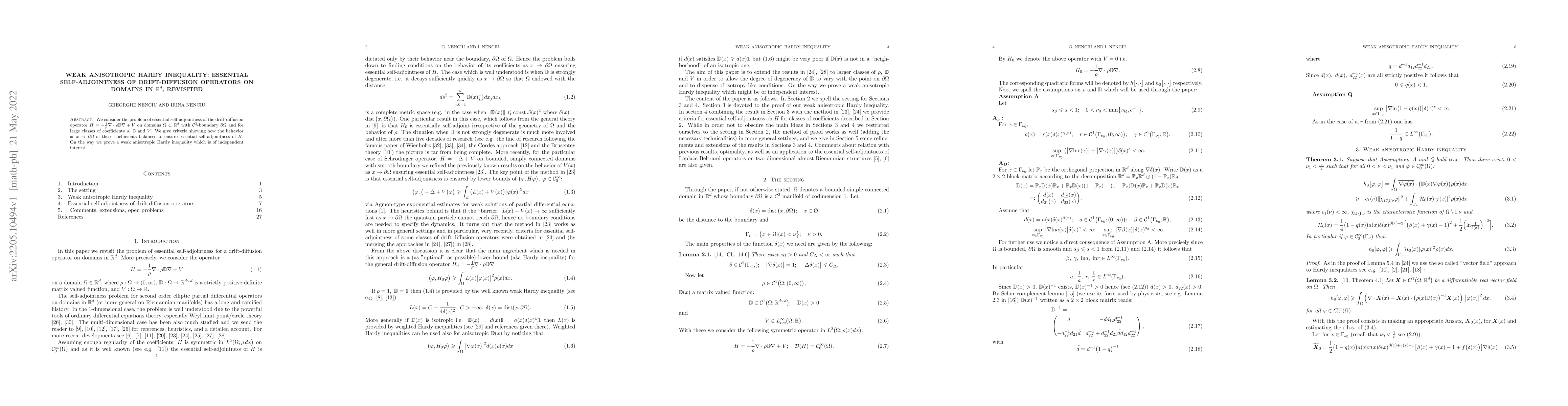 This paper investigates the essential self-adjointness of the drift-diffusion operator $H$ on $\mathcal{C}^2$ domains in $\mathbb{R}^d$ and provides criteria for coefficients $\rho$, $\mathbb{D}$, and $V$ ensuring this property. It also proves a weak anisotropic Hardy inequality as a significant result.