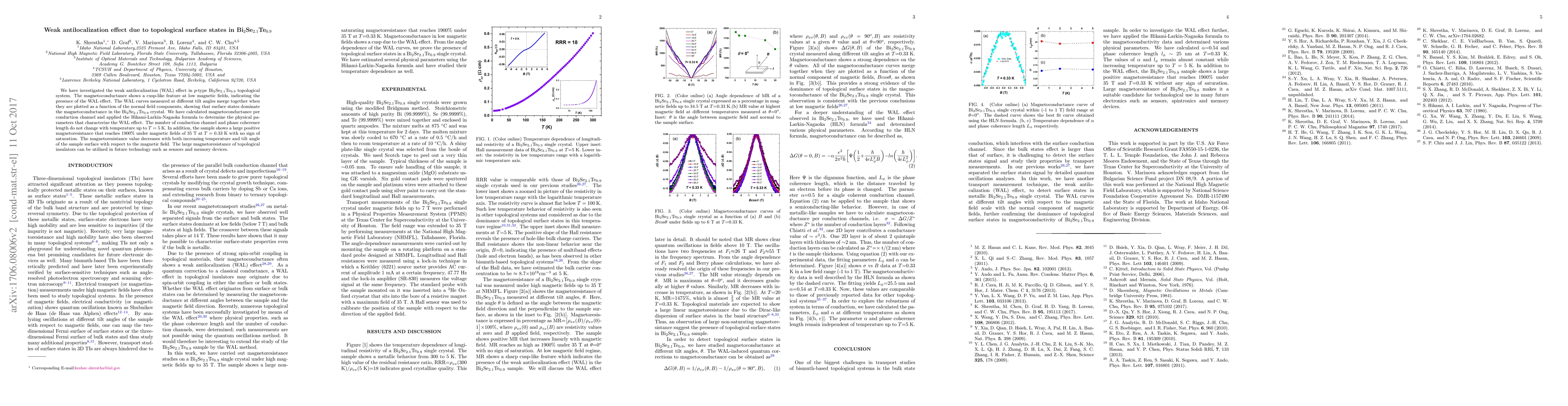 The research examines weak antilocalization (WAL) in Bi2Se2.1Te0.9, finding WAL curves independent of tilt angles, suggesting surface states dominance. The study also reports a large, unsaturated positive magnetoresistance up to 1900% at 35T and 0.33K, potentially beneficial for future sensor and memory device technologies.
