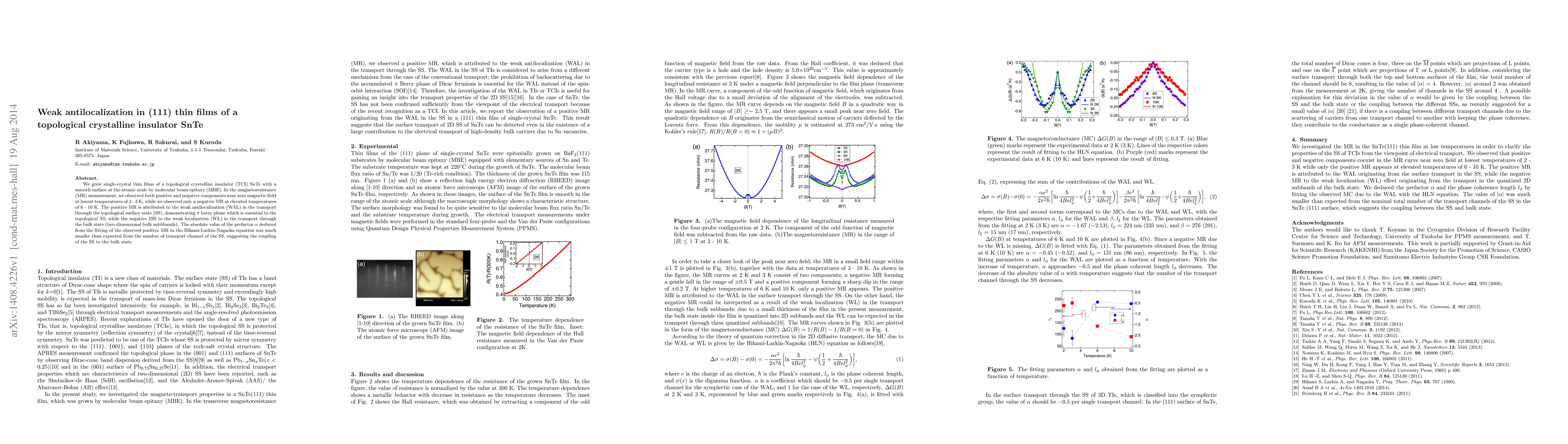 This study investigates the magnetoresistance in (111) thin films of the topological crystalline insulator SnTe, revealing weak antilocalization attributed to the topological surface state and weak localization due to bulk states. The observed coupling between surface and bulk states is indicated by a smaller-than-expected prefactor in the positive magnetoresistance.