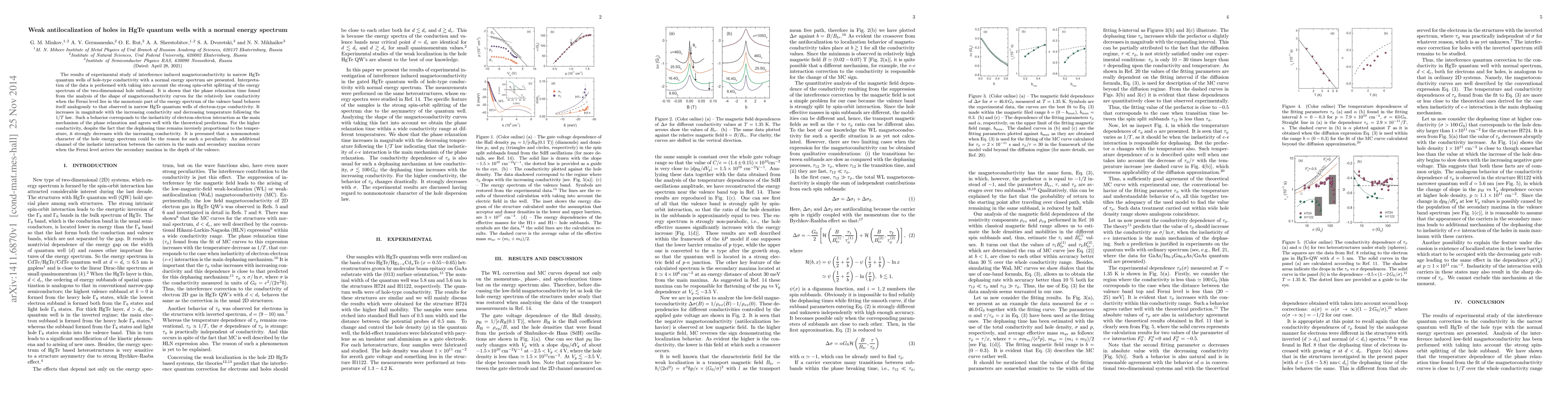 This paper investigates weak antilocalization in hole-type HgTe quantum wells, revealing that phase relaxation time follows a $1/T$ law at low conductivity, indicating electron-electron interaction as the main relaxation mechanism. At higher conductivity, the dephasing time decreases sharply, suggesting an additional inelastic interaction channel due to the nonmonotonic hole energy spectrum.