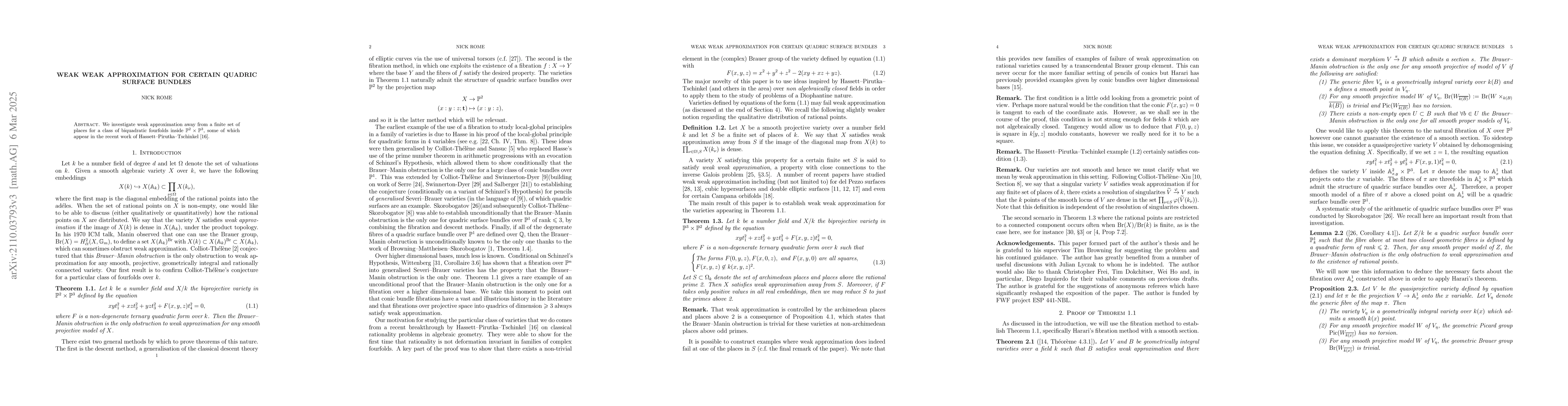 Summary: This paper examines weak approximation properties for a specific class of biquadratic fourfolds embedded in $\mathbb{P}^3 \times \mathbb{P}^2$, with connections to the recent findings in the work of Hassett--Pirutka--Tschinkel.