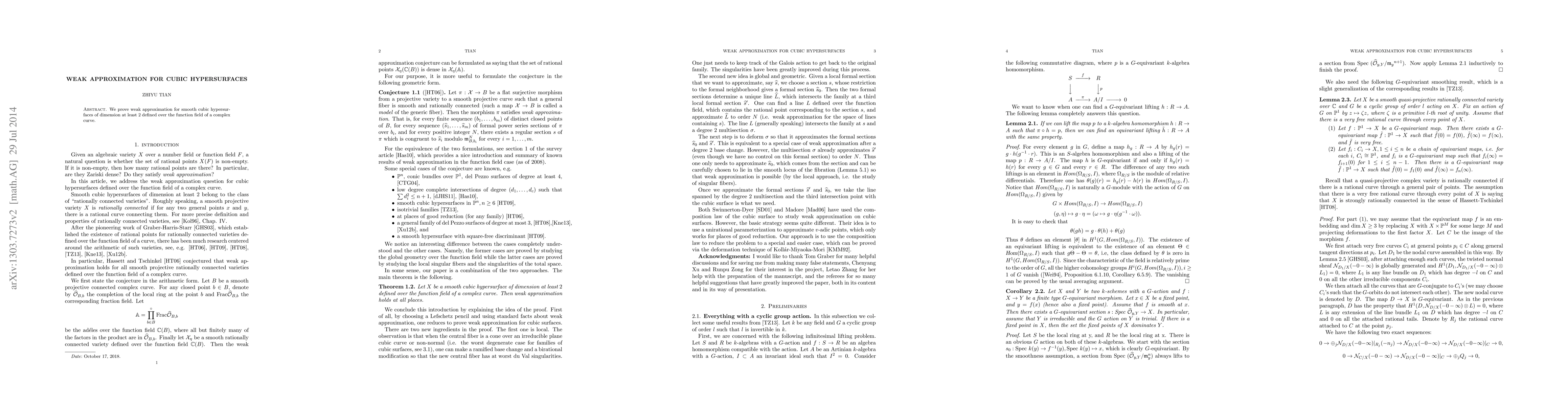 Summary: This paper proves weak approximation for smooth cubic hypersurfaces of dimension at least 2 over the function field of a complex curve, establishing the absence of obstructions to the existence of points near rational points.