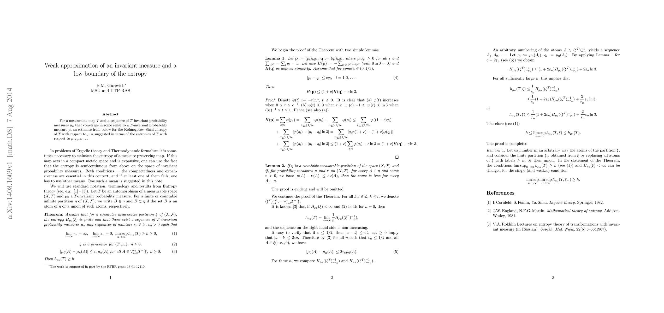 For a measurable map $T$ and a sequence of $T$-invariant probability measures $\mu_n$ that converges in some sense to a $T$-invariant probability measure $\mu$, an estimate from below for the Kolmogorov--Sinai entropy of $T$ with respect to $\mu$ is suggested in terms of the entropies of $T$ with respect to $\mu_1$, $\mu_2$, \dots.