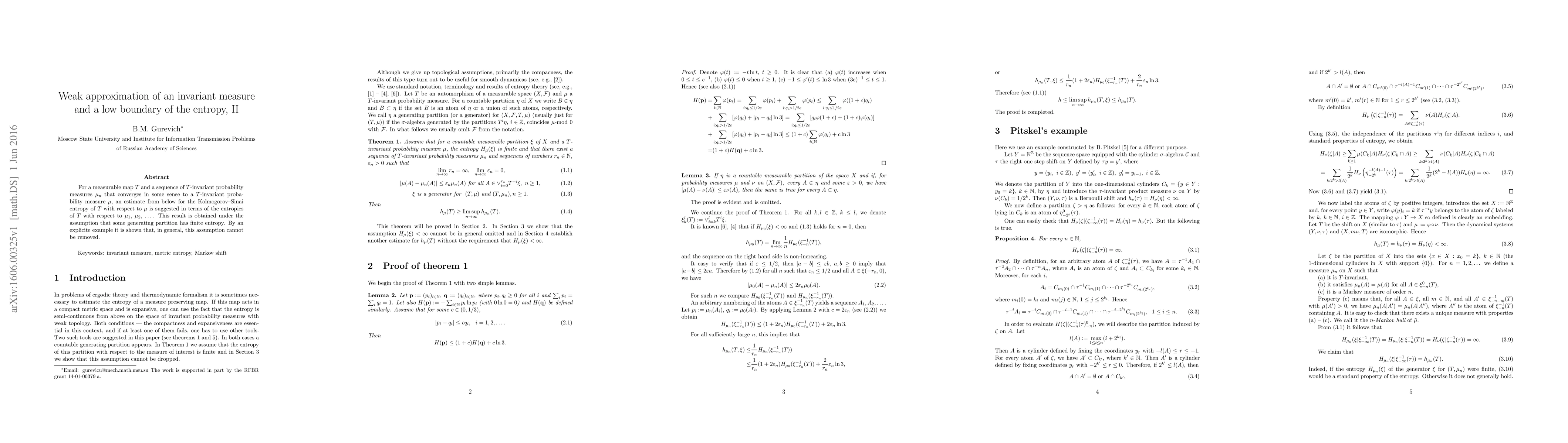 For a measurable map $T$ and a sequence of $T$-invariant probability measures $\mu_n$ that converges in some sense to a $T$-invariant probability measure $\mu$, an estimate from below for the Kolmogorov--Sinai entropy of $T$ with respect to $\mu$ is suggested in terms of the entropies of $T$ with respect to $\mu_1$, $\mu_2$, \dots. This result is obtained under the assumption that some generating partition has finite entropy. By an explicite example it is shown that, in general, this assumption cannot be removed.