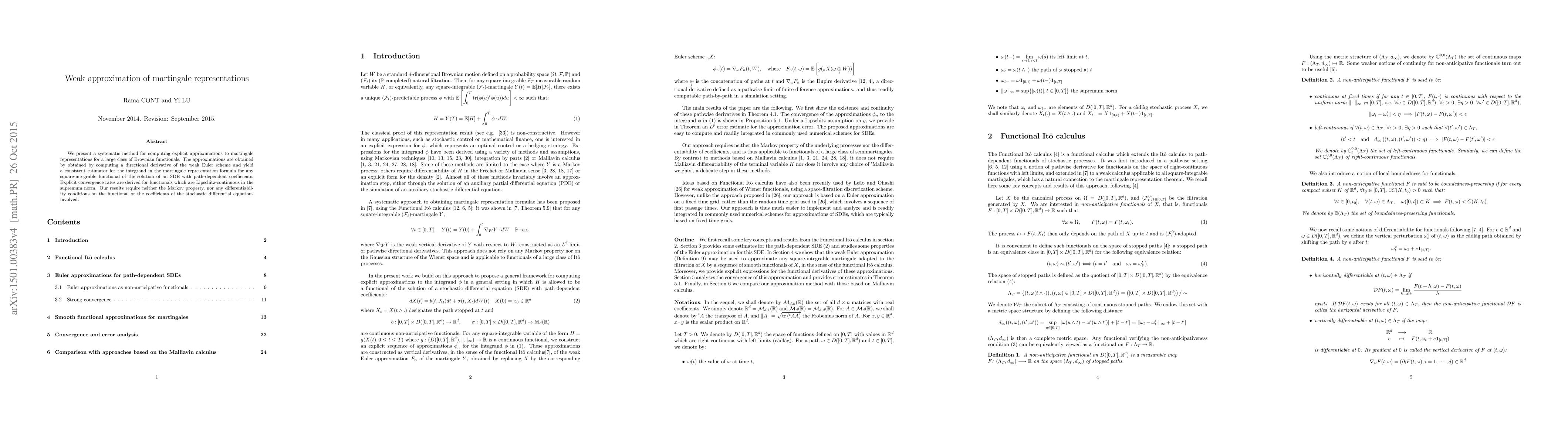 We present a systematic method for computing explicit approximations to martingale representations for a large class of Brownian functionals. The approximations are obtained by obtained by computing a directional derivative of the weak Euler scheme and yield a consistent estimator for the integrand in the martingale representation formula for any square-integrable functional of the solution of an SDE with path-dependent coefficients. Explicit convergence rates are derived for functionals which are Lipschitz-continuous in the supremum norm. Our results require neither the Markov property, nor any differentiability conditions on the functional or the coefficients of the stochastic differential equations involved.