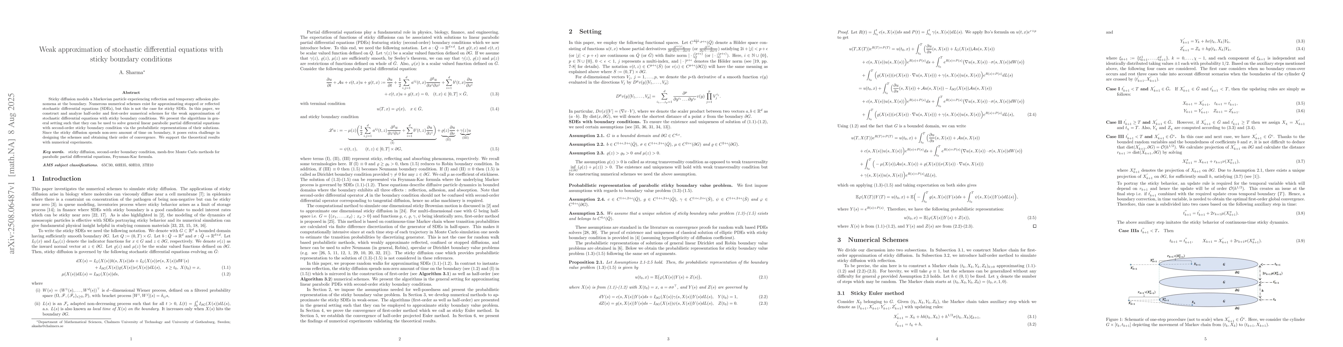 Sticky diffusion models a Markovian particle experiencing reflection and temporary adhesion phenomena at the boundary. Numerous numerical schemes exist for approximating stopped or reflected stochastic differential equations (SDEs), but this is not the case for sticky SDEs. In this paper, we construct and analyze half-order and first-order numerical schemes for the weak approximation of stochastic differential equations with sticky boundary conditions. We present the algorithms in general setting such that they can be used to solve general linear parabolic partial differential equations with second-order sticky boundary condition via the probabilistic representations of their solutions. Since the sticky diffusion spends non-zero amount of time on boundary, it poses extra challenge in designing the schemes and obtaining their order of convergence. We support the theoretical results with numerical experiments.