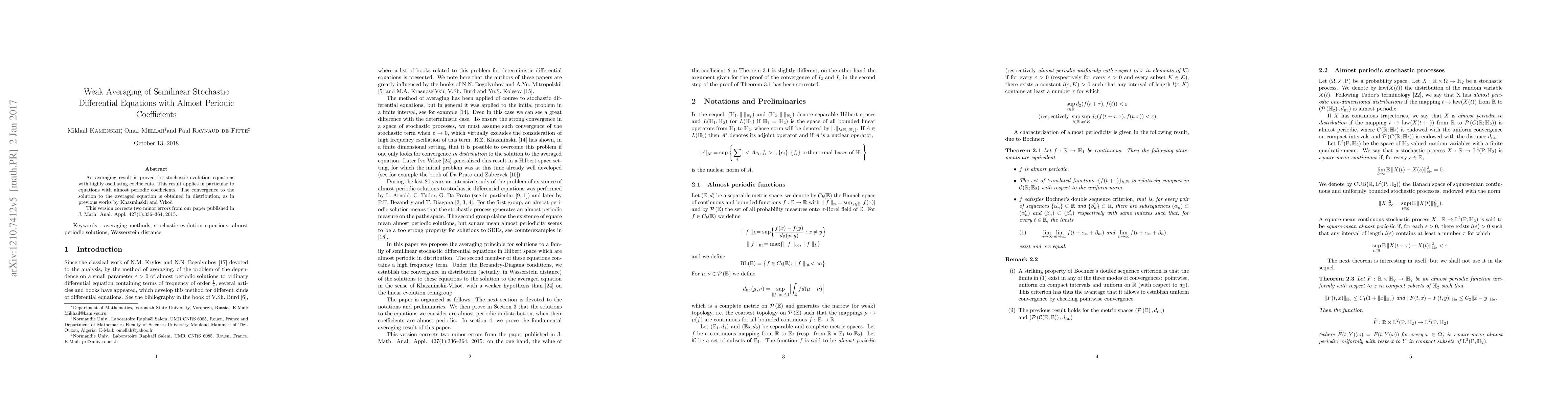 This paper proves an averaging result for semilinear stochastic differential equations with almost periodic coefficients, showing convergence to the solution of the averaged equation in distribution. It corrects minor errors from a previous publication in J. Math. Anal. Appl. (2015).