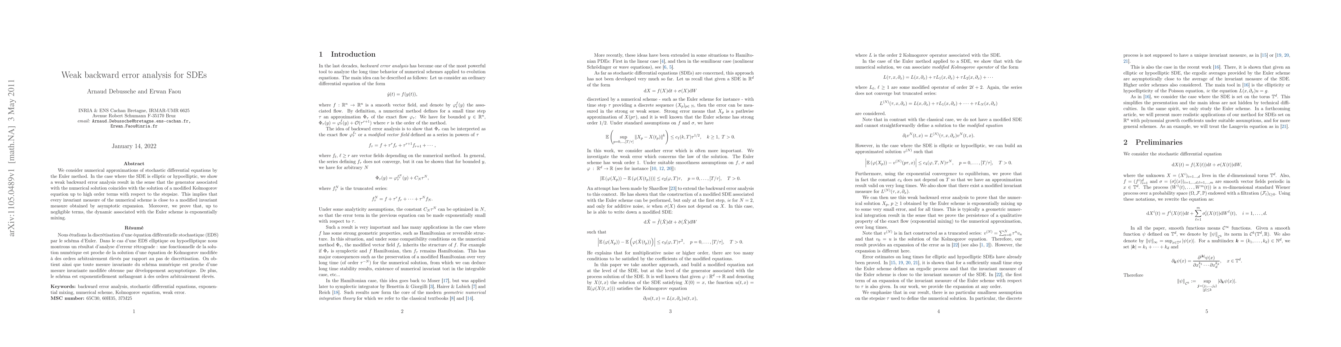 Summary: This paper presents a weak backward error analysis for the Euler method applied to elliptic or hypoelliptic stochastic differential equations (SDEs), demonstrating that the generator of the numerical solution matches the modified Kolmogorov equation solution, and proving exponential mixing of the Euler scheme's dynamics.