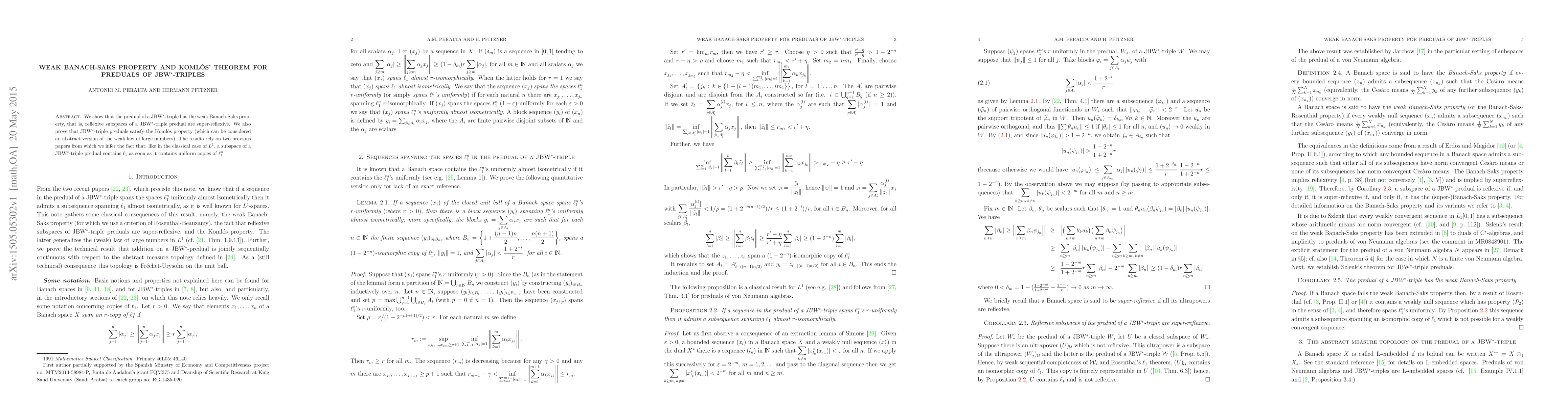 We show that the predual of a JBW$^*$-triple has the weak Banach-Saks property, that is, reflexive subspaces of a JBW$^*$-triple predual are super-reflexive. We also prove that JBW$^*$-triple preduals satisfy the Koml\'os property (which can be considered an abstract version of the weak law of large numbers). The results rely on two previous papers from which we infer the fact that, like in the classical case of $L^1$, a subspace of a JBW$^*$-triple predual contains $\ell_1$ as soon as it contains uniform copies of $\ell_1^n$.