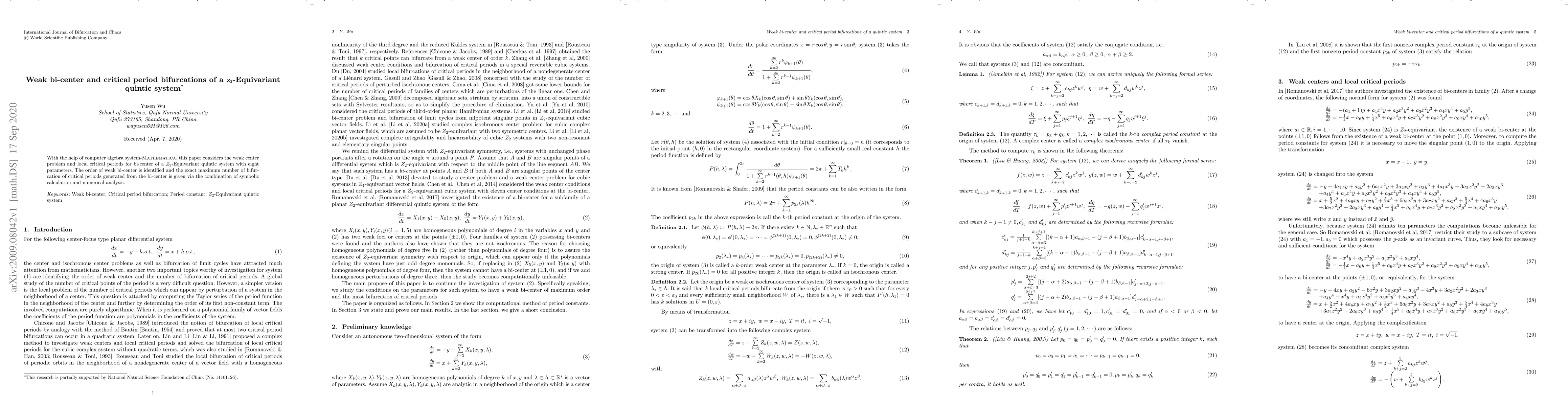 This paper uses Mathematica to study a $Z_2$-Equivariant quintic system, identifying the weak bi-center's order and determining the maximum number of bifurcations of critical periods through symbolic and numerical analysis.