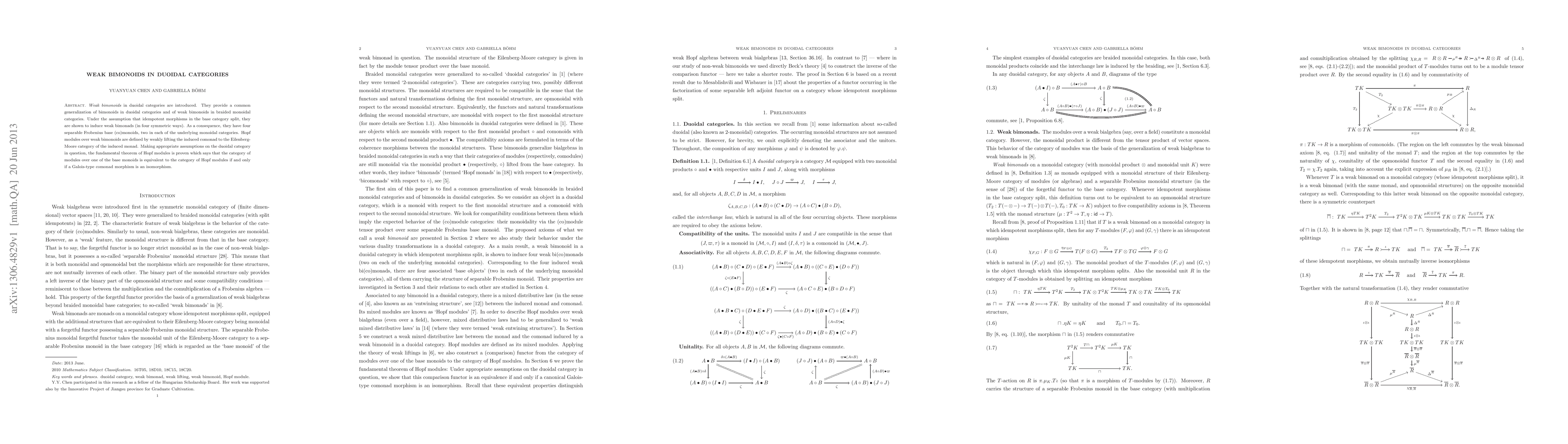 Weak bimonoids in duoidal categories are introduced. They provide a common generalization of bimonoids in duoidal categories and of weak bimonoids in braided monoidal categories. Under the assumption that idempotent morphisms in the base category split, they are shown to induce weak bimonads (in four symmetric ways). As a consequence, they have four separable Frobenius base (co)monoids, two in each of the underlying monoidal categories. Hopf modules over weak bimonoids are defined by weakly lifting the induced comonad to the Eilenberg-Moore category of the induced monad. Making appropriate assumptions on the duoidal category in question, the fundamental theorem of Hopf modules is proven which says that the category of modules over one of the base monoids is equivalent to the category of Hopf modules if and only if a Galois-type comonad morphism is an isomorphism.