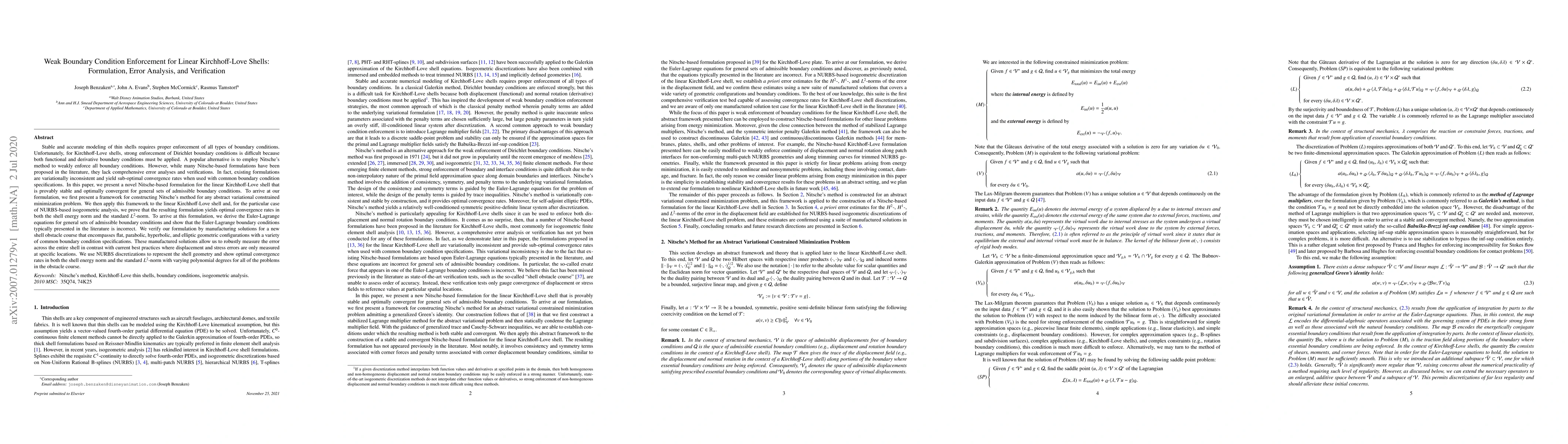 This paper presents a novel Nitsche-based formulation for weakly enforcing boundary conditions in linear Kirchhoff-Love shells, providing a comprehensive error analysis and optimal convergence rates. The authors verify their approach through a new shell obstacle course with manufactured solutions, measuring errors across the entire shell.