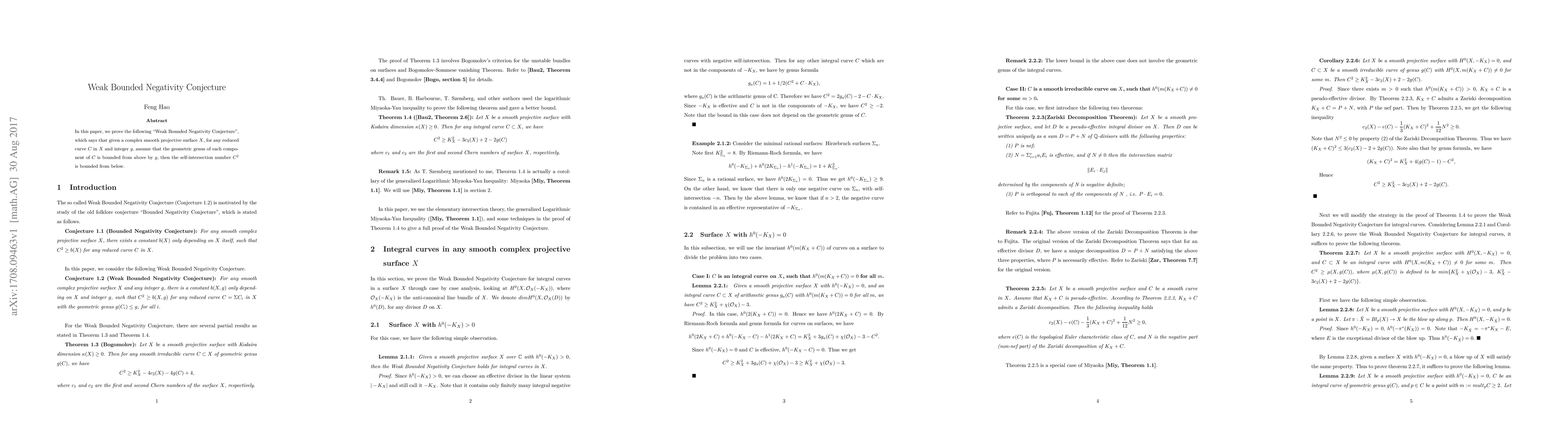 This paper proves the Weak Bounded Negativity Conjecture for complex smooth projective surfaces, showing that if the geometric genus of each component of a reduced curve is bounded above by a fixed integer, then the self-intersection number of the curve is bounded below.