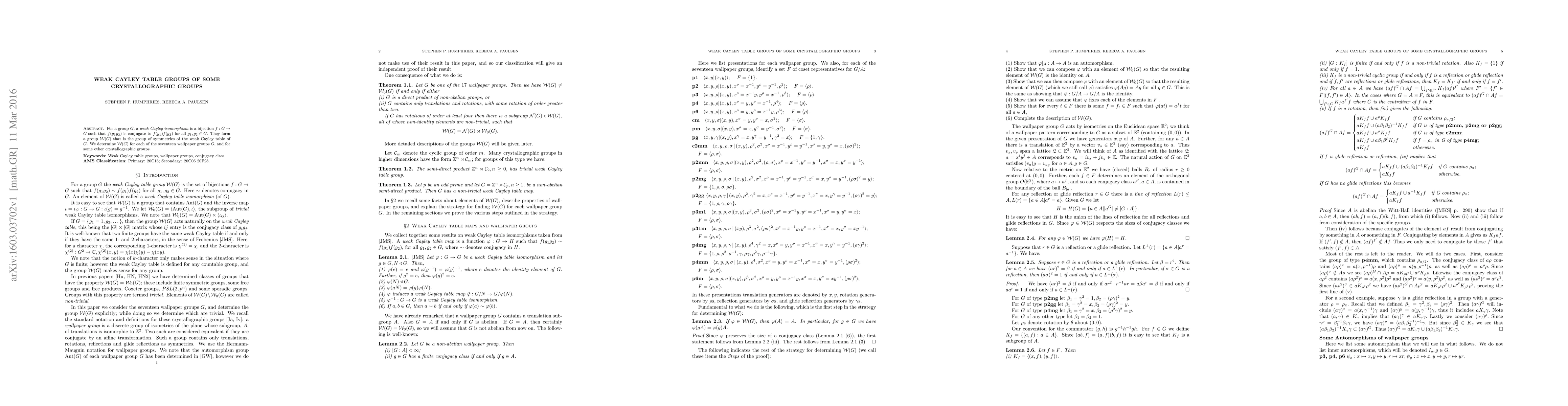 For a group $G$, a weak Cayley isomorphism is a bijection $f:G \to G$ such that $f(g_1g_2)$ is conjugate to $ f(g_1)f(g_2)$ for all $g_1,g_2 \in G$. They form a group $\mathcal W(G)$ that is the group of symmetries of the weak Cayley table of $G$. We determine $\mathcal W(G)$ for each of the seventeen wallpaper groups $G$, and for some other crystallographic groups.