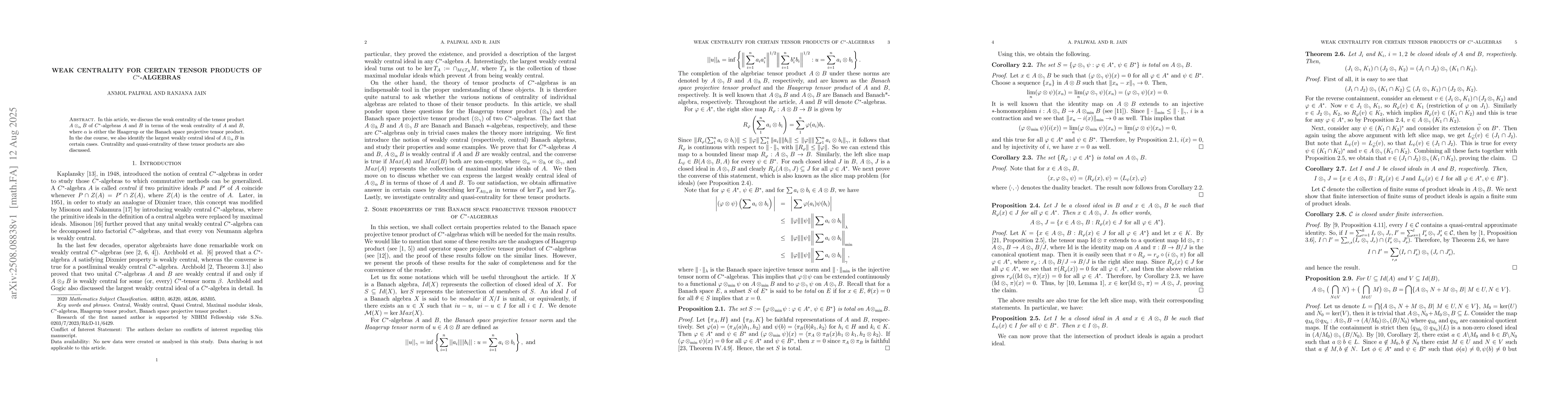 In this article, we discuss the weak centrality of the tensor product $A\otimes_\alpha B$ of $C^\ast$-algebras $A$ and $B$ in terms of the weak centrality of $A$ and $B$, where $\alpha$ is either the Haagerup or the Banach space projective tensor product. In the due course, we also identify the largest weakly central ideal of $A\otimes_\alpha B$ in certain cases. Centralilty and quasi-centrality of these tensor products are also discussed.