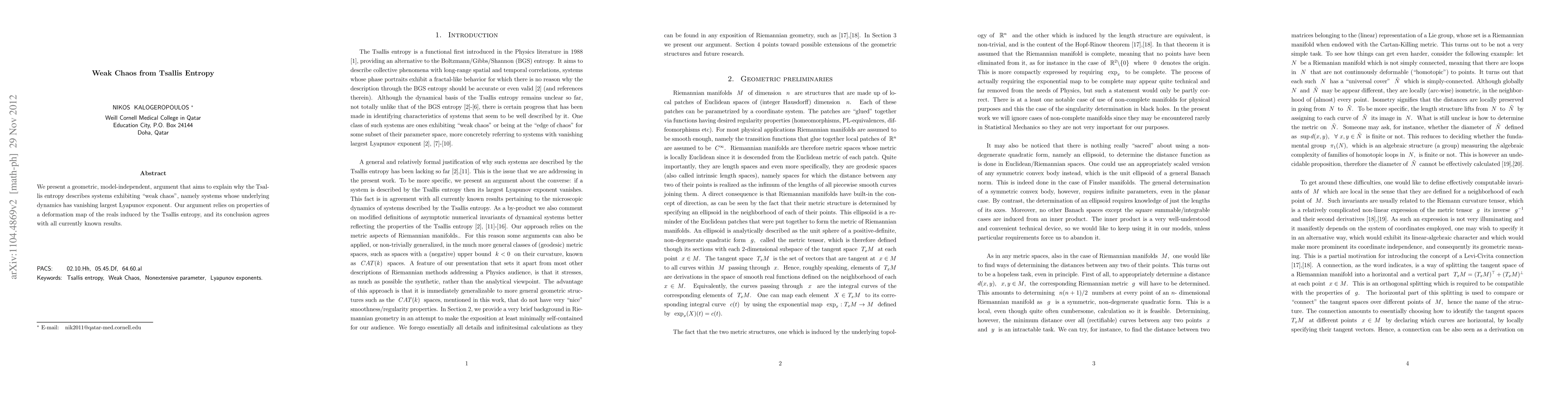 This paper argues that the Tsallis entropy can describe systems exhibiting "weak chaos" due to a deformation map of the reals, aligning with systems having a vanishing largest Lyapunov exponent, and confirms existing results.