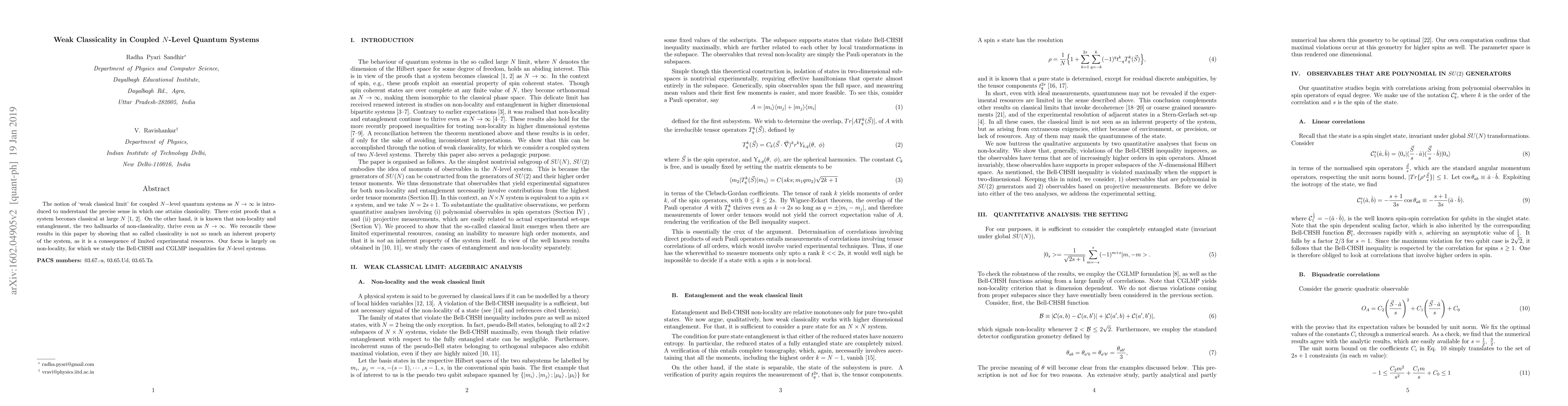 This paper introduces the concept of a "weak classical limit" in coupled N-level quantum systems as N approaches infinity, demonstrating that classicality emerges due to limited experimental resources rather than inherent properties. It particularly examines non-locality through the Bell-CHSH and CGLMP inequalities, showing that entanglement persists even in large N systems.