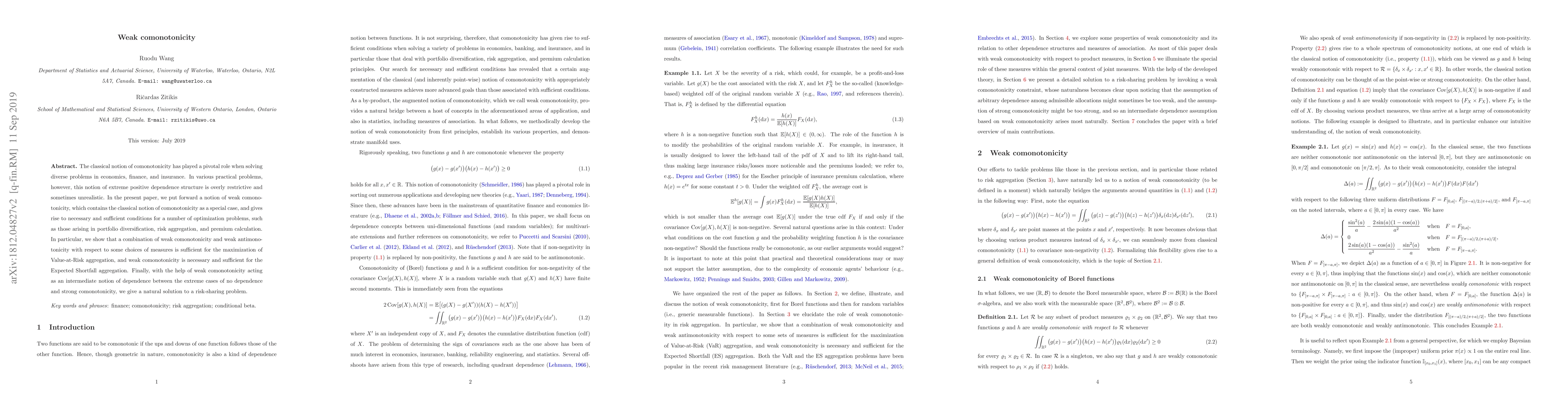 The classical notion of comonotonicity has played a pivotal role when solving diverse problems in economics, finance, and insurance. In various practical problems, however, this notion of extreme positive dependence structure is overly restrictive and sometimes unrealistic. In the present paper, we put forward a notion of weak comonotonicity, which contains the classical notion of comonotonicity as a special case, and gives rise to necessary and sufficient conditions for a number of optimization problems, such as those arising in portfolio diversification, risk aggregation, and premium calculation. In particular, we show that a combination of weak comonotonicity and weak antimonotonicity with respect to some choices of measures is sufficient for the maximization of Value-at-Risk aggregation, and weak comonotonicity is necessary and sufficient for the Expected Shortfall aggregation. Finally, with the help of weak comonotonicity acting as an intermediate notion of dependence between the extreme cases of no dependence and strong comonotonicity, we give a natural solution to a risk-sharing problem.