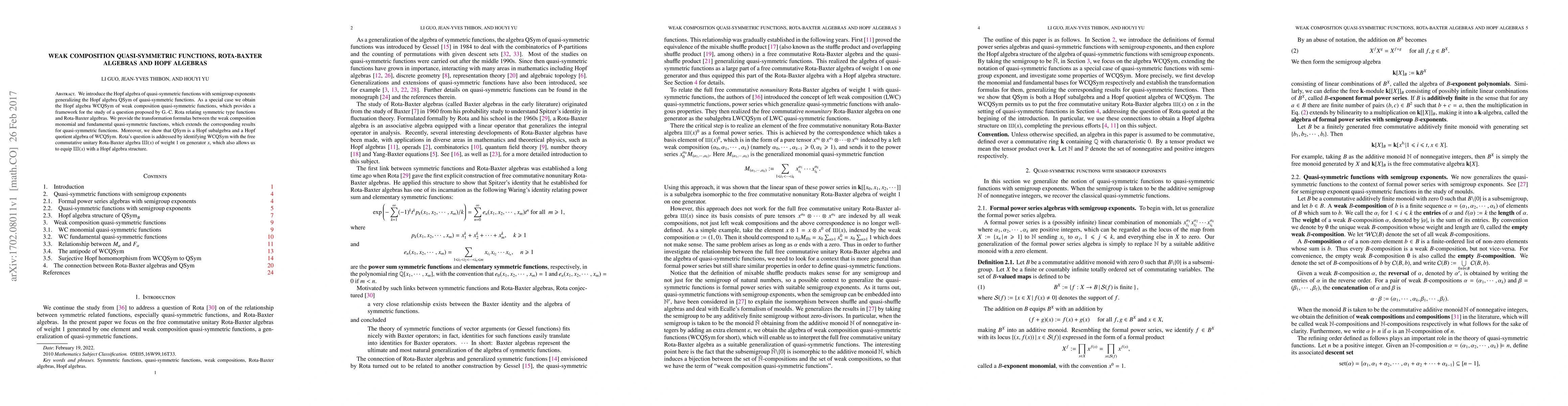 We introduce the Hopf algebra of quasi-symmetric functions with semigroup exponents generalizing the Hopf algebra QSym of quasi-symmetric functions. As a special case we obtain the Hopf algebra WCQSym of weak composition quasi-symmetric functions, which provides a framework for the study of a question proposed by G.-C.~Rota relating symmetric type functions and Rota-Baxter algebras. We provide the transformation formulas between the weak composition monomial and fundamental quasi-symmetric functions, which extends the corresponding results for quasi-symmetric functions. Moreover, we show that QSym is a Hopf subalgebra and a Hopf quotient algebra of WCQSym. Rota's question is addressed by identifying WCQsym with the free commutative unitary Rota-Baxter algebra of weight 1 on one generator, which also allows us to equip this algebra with a Hopf algebra structure.