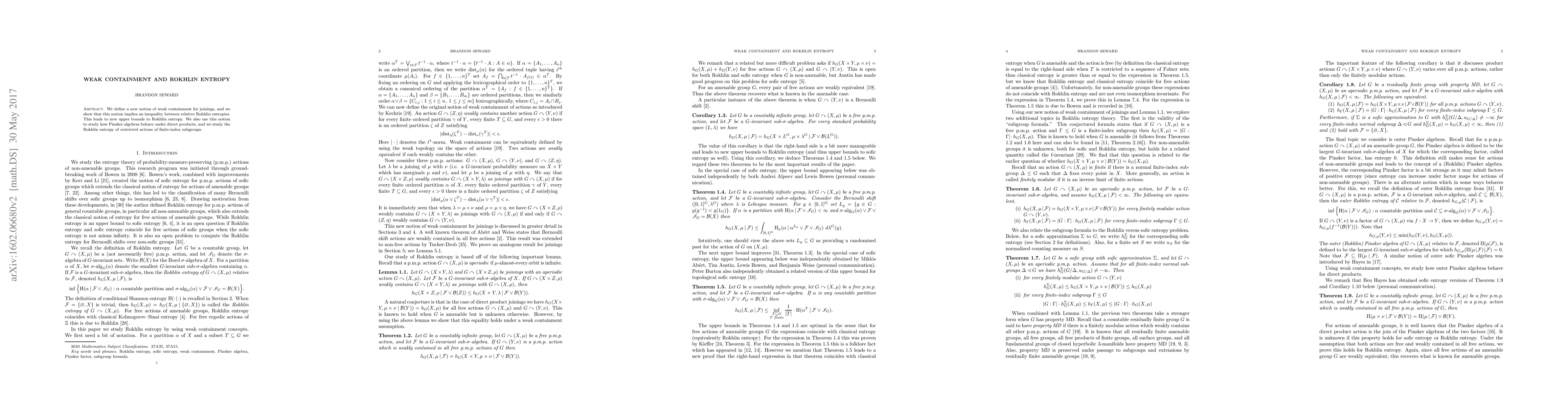 We define a new notion of weak containment for joinings, and we show that this notion implies an inequality between relative Rokhlin entropies. This leads to new upper bounds to Rokhlin entropy. We also use this notion to study how Pinsker algebras behave under direct products, and we study the Rokhlin entropy of restricted actions of finite-index subgroups.