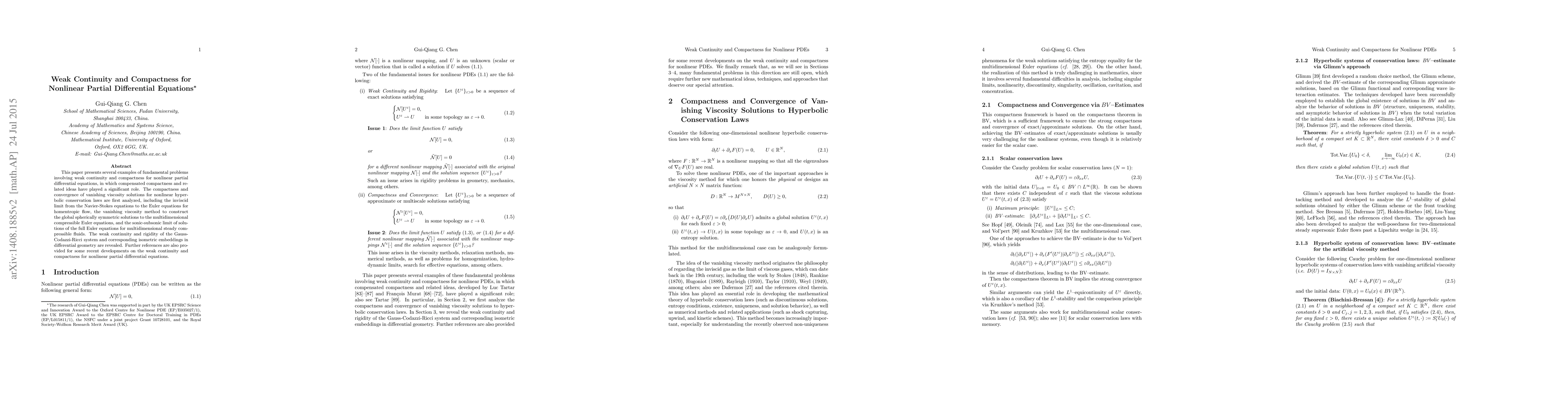 This paper explores weak continuity and compactness in nonlinear partial differential equations, focusing on the vanishing viscosity method for nonlinear hyperbolic conservation laws and the convergence of solutions. It also examines the Gauss-Codazzi-Ricci system and its implications for differential geometry.