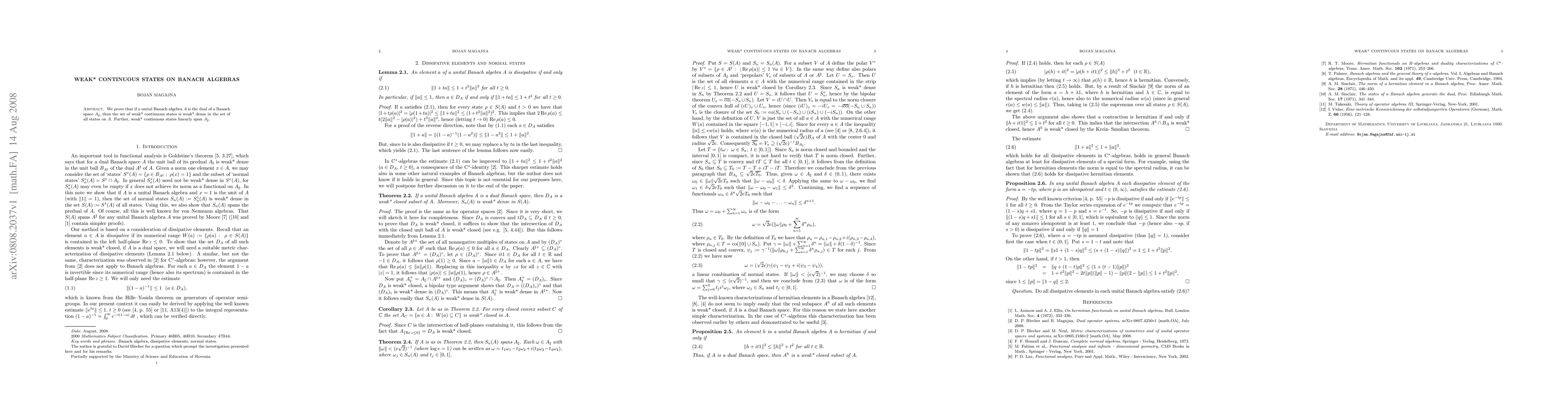 We prove that if a unital Banach algebra $A$ is the dual of a Banach space $\pd{A}$, then the set of weak* continuous states is weak* dense in the set of all states on $A$. Further, weak* continuous states linearly span $\pd{A}$.