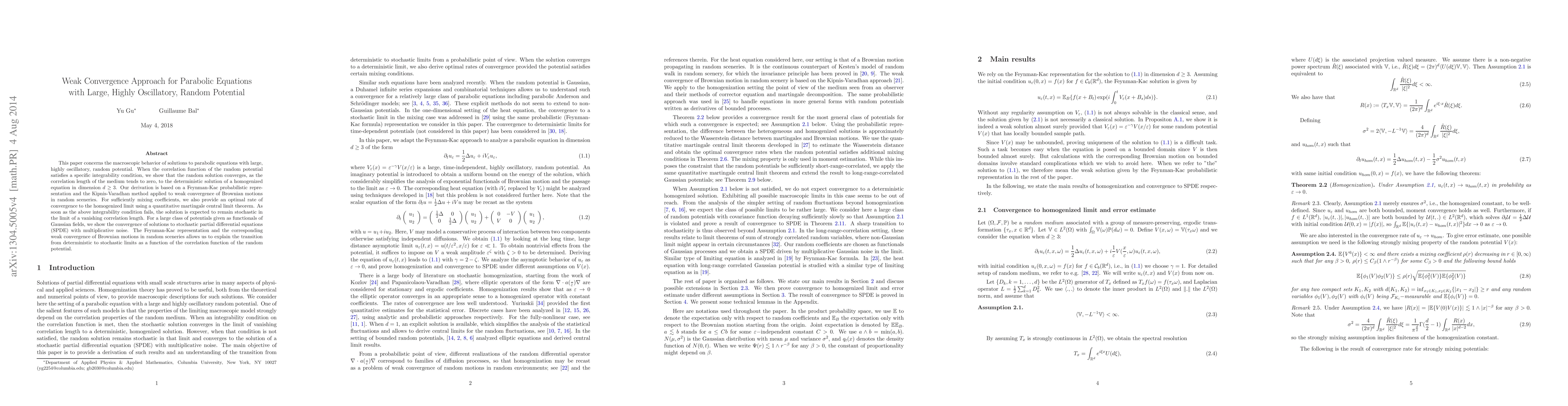 This paper investigates the macroscopic behavior of solutions to parabolic equations with large, highly oscillatory, random potential. It demonstrates weak convergence to a homogenized deterministic solution under specific integrability conditions, using a Feynman-Kac representation and the Kipnis-Varadhan method. When the integrability condition fails, the solution converges to a stochastic partial differential equation with multiplicative noise.