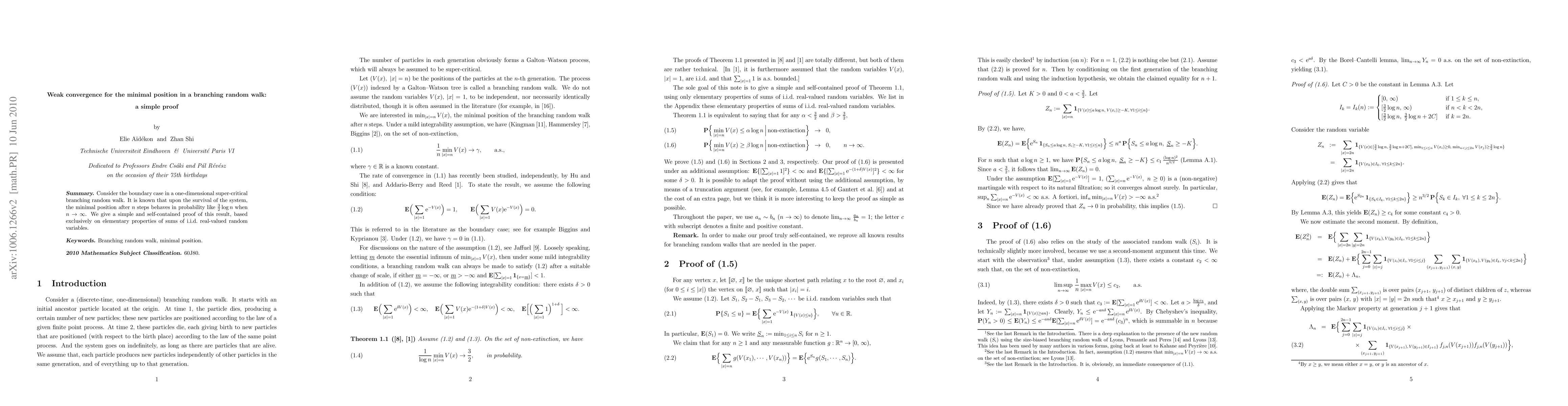 Consider the boundary case in a one-dimensional super-critical branching random walk. It is known that upon the survival of the system, the minimal position after $n$ steps behaves in probability like ${3\over 2} \log n$ when $n\to \infty$. We give a simple and self-contained proof of this result, based exclusively on elementary properties of sums of i.i.d. real-valued random variables.