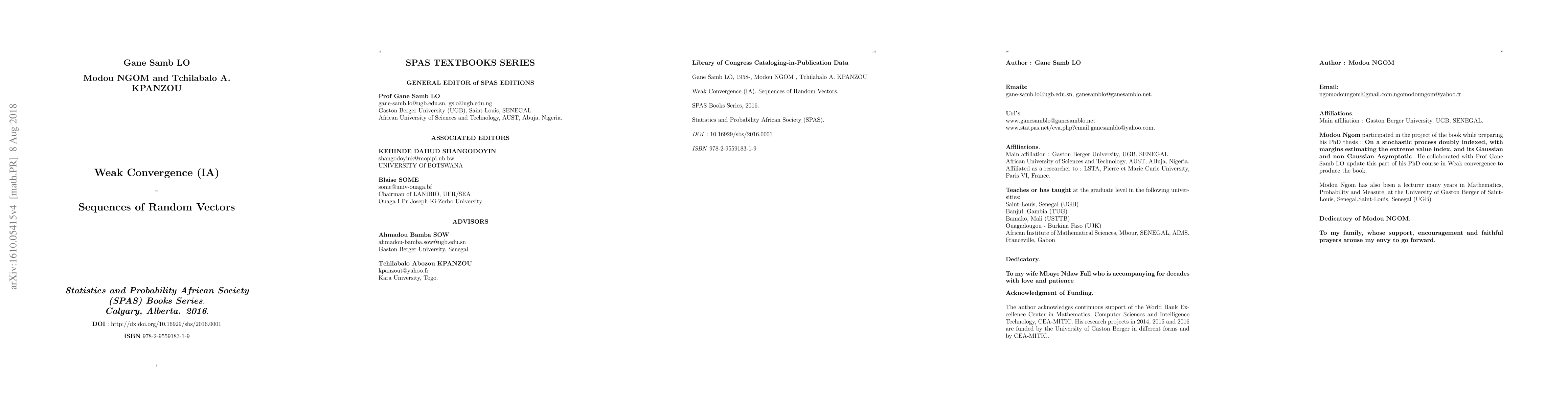 (English) This monograph aims at presenting the core weak convergence theory for sequences of random vectors with values in $\mathbb{R}^k$. In some places, a more general formulation in metric spaces is provided. It lays out the necessary foundation that paves the way to applications in particular subfields of the theory. In particular, the needs of Asymptotic Statistics are addressed. A whole chapter is devoted to weak convergence in $\mathbb{R}$ where specific tools, for example for handling weak convergence of sequences using independent and indentically distributed random variables such that the Renyi's representations by means of standard uniform or exponential random variables, are stated. The function empirical process is presented as a powerful tool for solving a considerable number of asymptotic problems in Statistics. The text is written in a self-contained approach whith the proofs of all used results at the exception of the general Skorohod-Wichura Theorem.