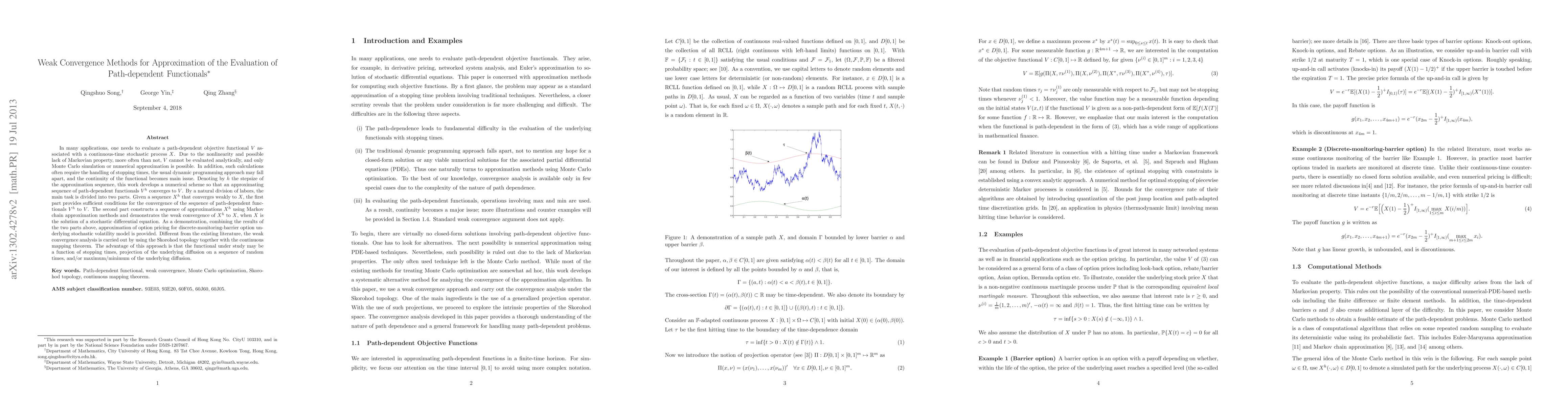This paper provides convergence analysis for the approximation of a class of path-dependent functionals underlying a continuous stochastic process. In the first part, given a sequence of weak convergent processes, we provide a sufficient condition for the convergence of the path-dependent functional underlying weak convergent processes to the functional of the original process. In the second part, we study the weak convergence of Markov chain approximation to the underlying process when it is given by a solution of stochastic differential equation. Finally, we combine the results of the two parts to provide approximation of option pricing for discretely monitoring barrier option underlying stochastic volatility model. Different from the existing literatures, the weak convergence analysis is obtained by means of metric computations in the Skorohod topology together with the continuous mapping theorem. The advantage of this approach is that the functional under study may be a function of stopping times, projection of the underlying diffusion on a sequence of random times, or maximum/minimum of the underlying diffusion.