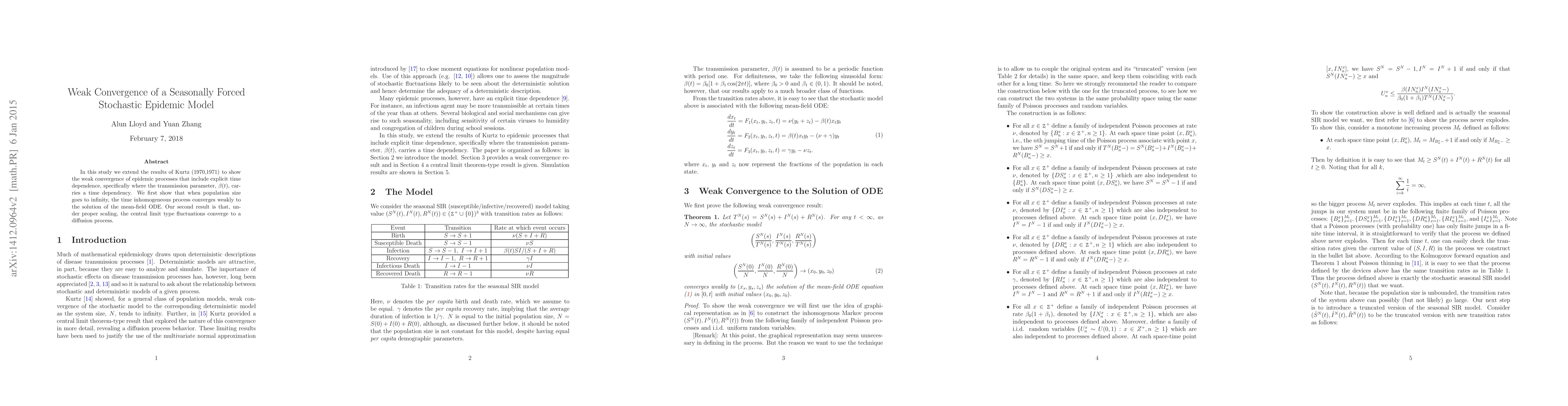 This paper extends Kurtz's results to demonstrate the weak convergence of seasonally forced stochastic epidemic models, showing that the time-inhomogeneous process converges to a mean-field ODE solution as population size increases, and the central limit fluctuations converge to a diffusion process.