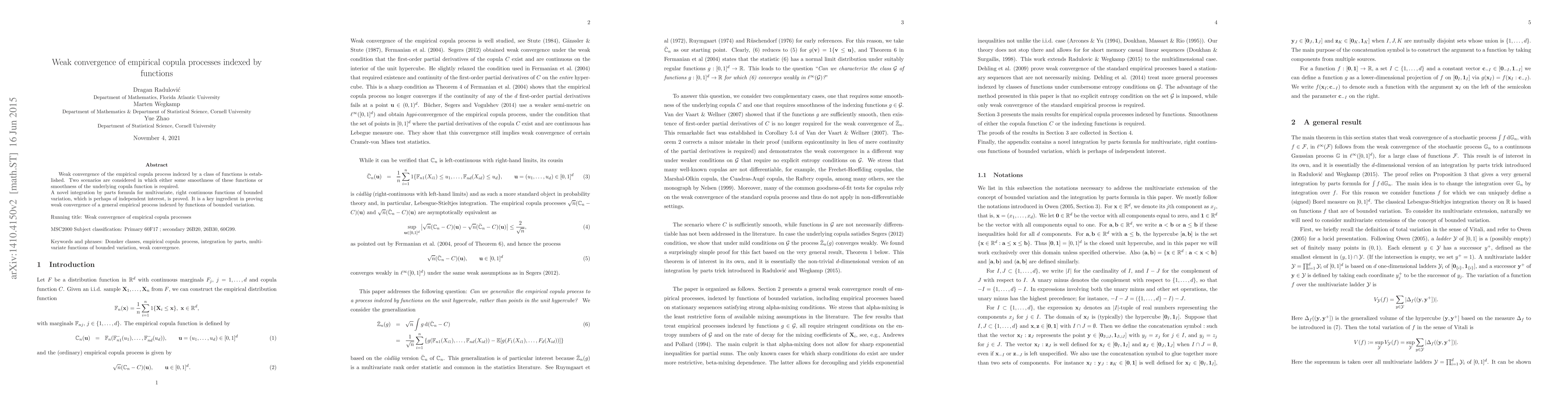 This paper establishes the weak convergence of empirical copula processes indexed by functions, requiring either smoothness of these functions or the underlying copula. A new integration by parts formula for multivariate, right continuous functions of bounded variation is developed, serving as a crucial tool in proving the convergence.