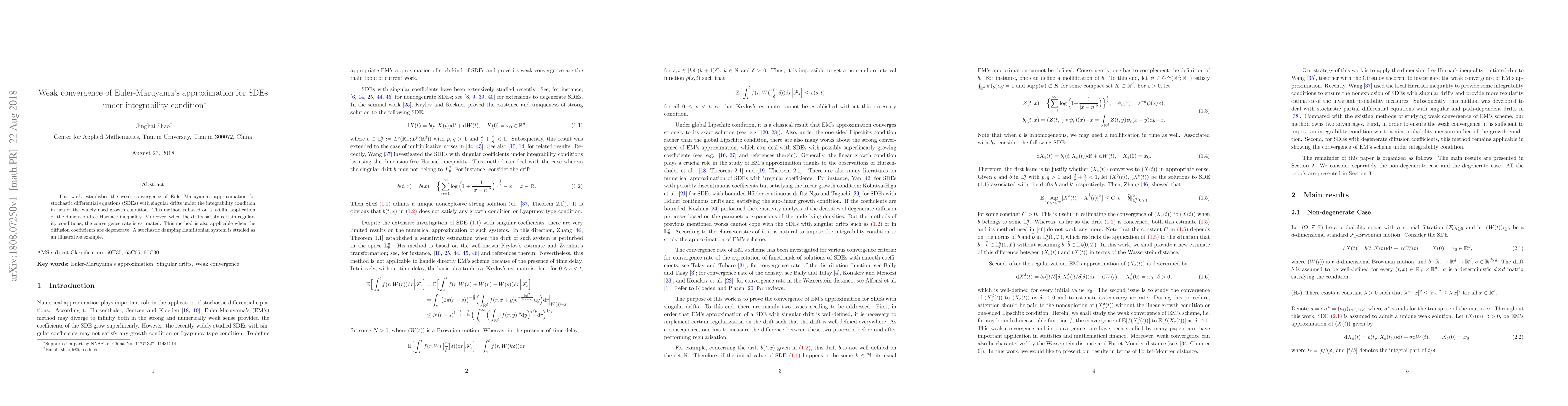 This paper proves the weak convergence of Euler-Maruyama's method for SDEs with singular drifts using an integrability condition instead of a growth condition, employing a dimension-free Harnack inequality. It also estimates the convergence rate under regularity conditions and applies the method to degenerate diffusion coefficients, illustrated with a stochastic damping Hamiltonian system.