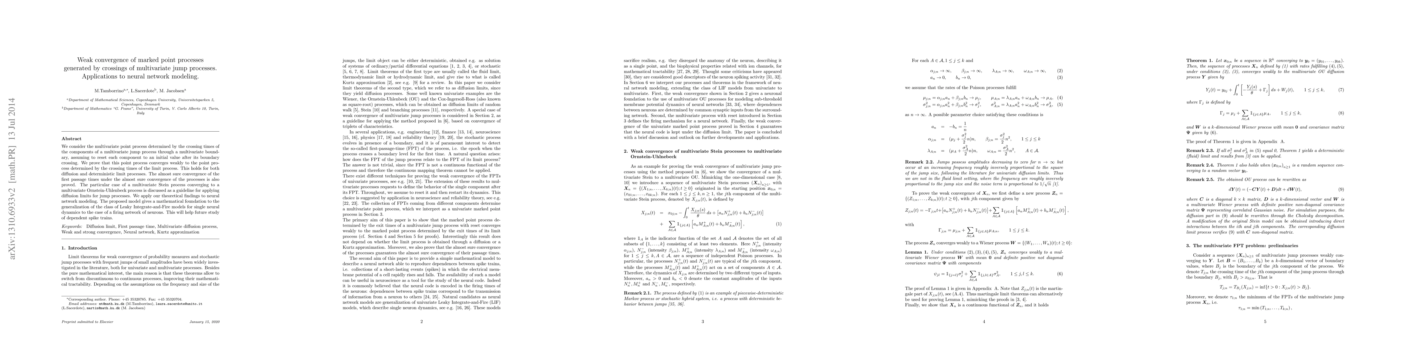 We consider the multivariate point process determined by the crossing times of the components of a multivariate jump process through a multivariate boundary, assuming to reset each component to an initial value after its boundary crossing. We prove that this point process converges weakly to the point process determined by the crossing times of the limit process. This holds for both diffusion and deterministic limit processes. The almost sure convergence of the first passage times under the almost sure convergence of the processes is also proved. The particular case of a multivariate Stein process converging to a multivariate Ornstein-Uhlenbeck process is discussed as a guideline for applying diffusion limits for jump processes. We apply our theoretical findings to neural network modeling. The proposed model gives a mathematical foundation to the generalization of the class of Leaky Integrate-and-Fire models for single neural dynamics to the case of a firing network of neurons. This will help future study of dependent spike trains.