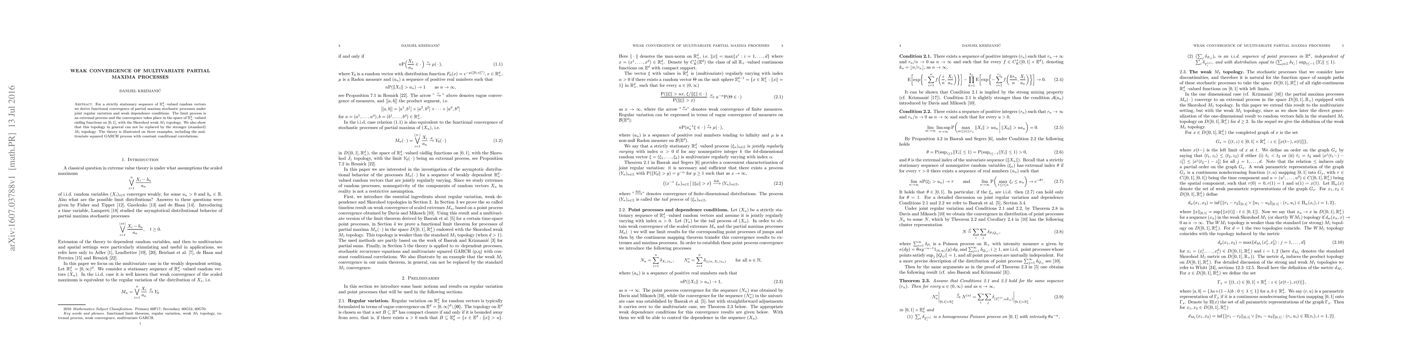 For a strictly stationary sequence of $\mathbb{R}_{+}^{d}$--valued random vectors we derive functional convergence of partial maxima stochastic processes under joint regular variation and weak dependence conditions. The limit process is an extremal process and the convergence takes place in the space of $\mathbb{R}_{+}^{d}$--valued c\`{a}dl\`{a}g functions on $[0,1]$, with the Skorohod weak $M_{1}$ topology. We also show that this topology in general can not be replaced by the stronger (standard) $M_{1}$ topology. The theory is illustrated on three examples, including the multivariate squared GARCH process with constant conditional correlations.