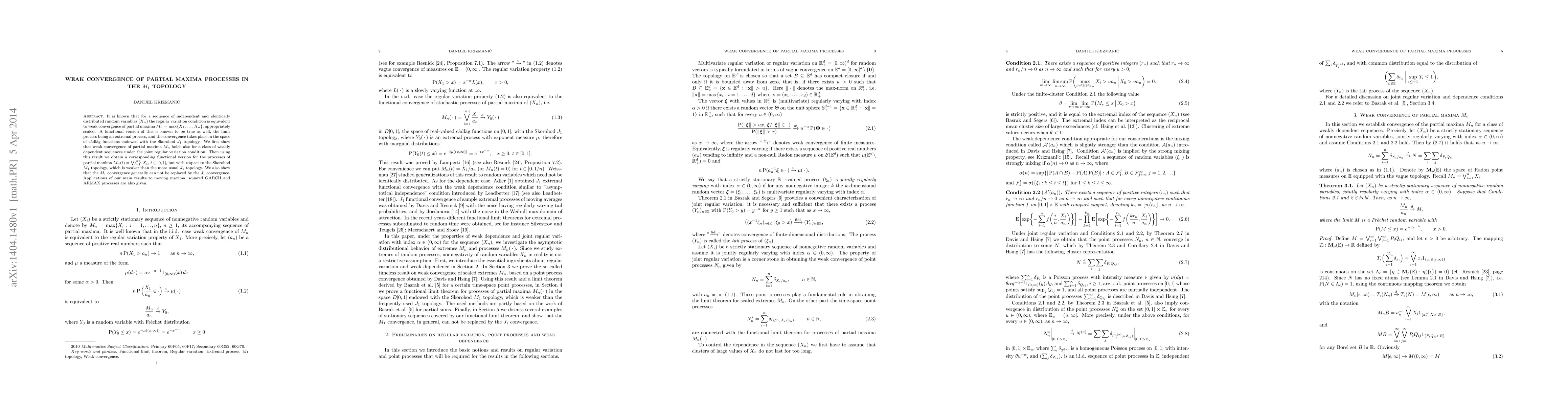 This paper explores the weak convergence of partial maxima processes for weakly dependent sequences under joint regular variation conditions, establishing convergence in the $M_{1}$ topology. It also contrasts this convergence with the $J_{1}$ topology, demonstrating applications to moving maxima, squared GARCH, and ARMAX processes.