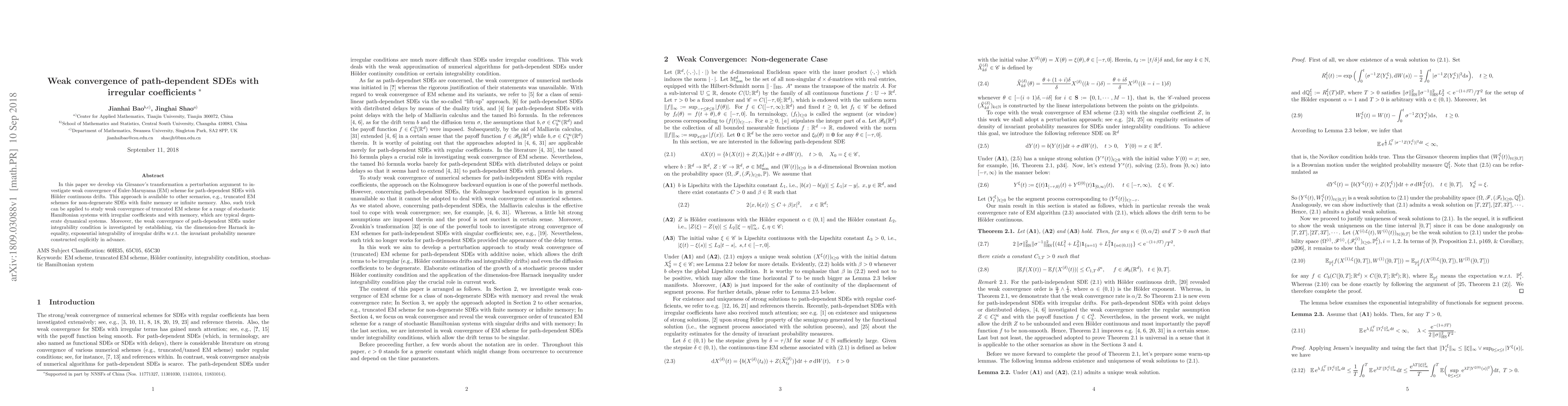 In this paper we develop via Girsanov's transformation a perturbation argument to investigate weak convergence of Euler-Maruyama (EM) scheme for path-dependent SDEs with H\"older continuous drifts. This approach is available to other scenarios, e.g., truncated EM schemes for non-degenerate SDEs with finite memory or infinite memory. Also, such trick can be applied to study weak convergence of truncated EM scheme for a range of stochastic Hamiltonian systems with irregular coefficients and with memory, which are typical degenerate dynamical systems. Moreover, the weak convergence of path-dependent SDEs under integrability condition is investigated by establishing, via the dimension-free Harnack inequality, exponential integrability of irregular drifts w.r.t. the invariant probability measure constructed explicitly in advance.