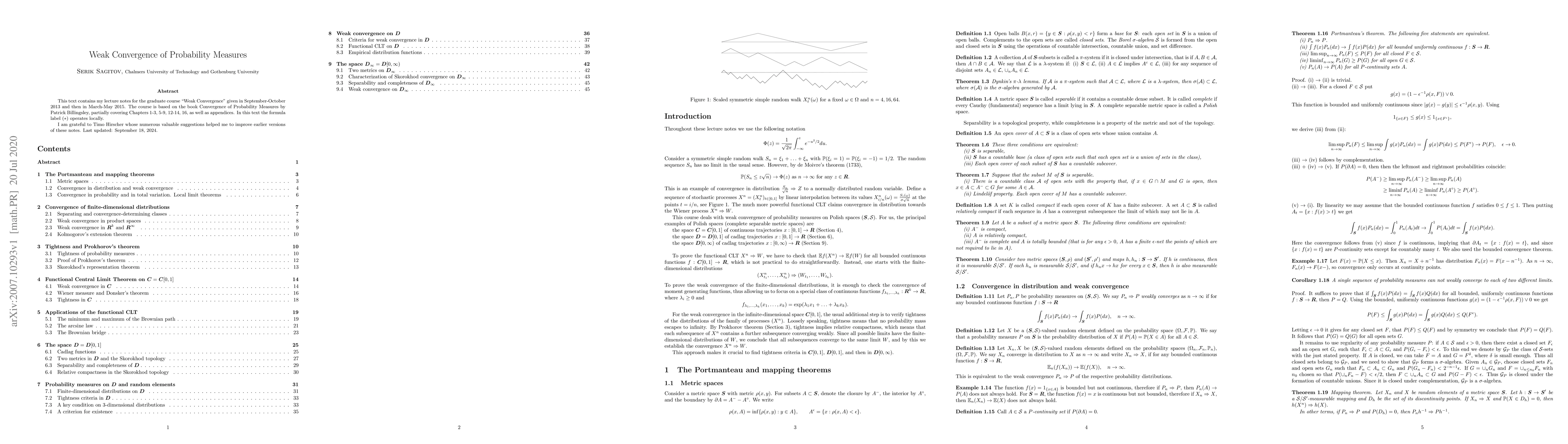 Summary: These lecture notes summarize key concepts from Patrick Billingsley's book on the weak convergence of probability measures, focusing on the theoretical foundations and practical implications of weak convergence in probability theory. The notes are designed to provide a comprehensive understanding of the topic for advanced students and researchers.