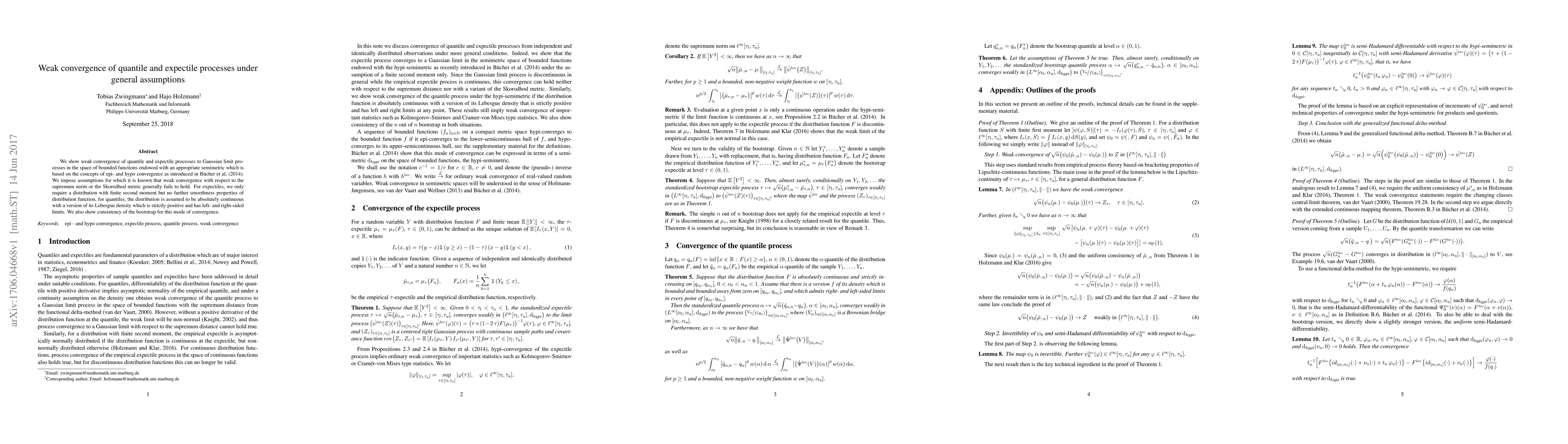 This paper demonstrates weak convergence of quantile and expectile processes to Gaussian limit processes under general assumptions, using a semimetric based on epi- and hypo convergence. It requires only finite second moments for expectiles and absolute continuity for quantiles, showing consistency of the bootstrap method for this convergence.