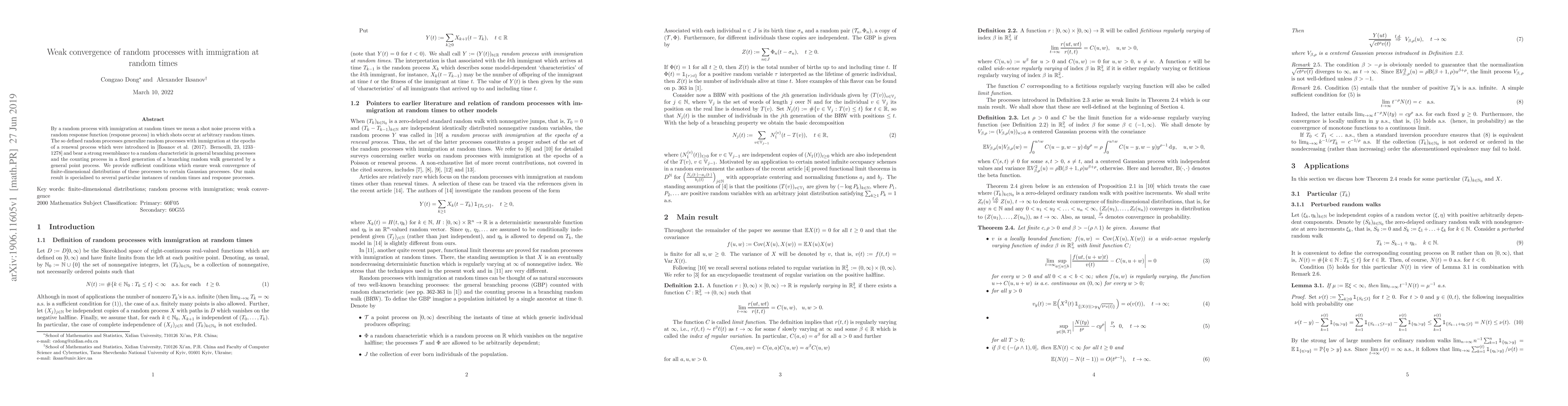 This paper studies random processes with immigration at random times, generalizing previous models with immigration at renewal epochs. It provides conditions for the weak convergence of their finite-dimensional distributions to Gaussian processes, with applications to branching processes and branching random walks.