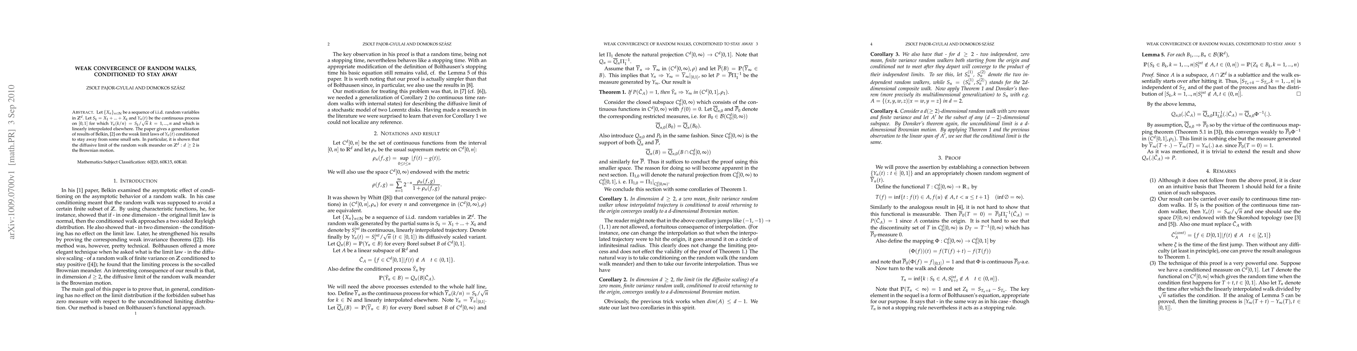 Let $\{X_n\}_{n\in\mathbb{N}}$ be a sequence of i.i.d. random variables in $\mathbb{Z}^d$. Let $S_k=X_1+...+X_k$ and $Y_n(t)$ be the continuous process on $[0,1]$ for which $Y_n(k/n)=S_k/\sqrt{n}$ $k=1,...,n$ and which is linearly interpolated elsewhere. The paper gives a generalization of results of Belkin, \cite{B72} on the weak limit laws of $Y_n(t)$ conditioned to stay away from some small sets. In particular, it is shown that the diffusive limit of the random walk meander on $\mathbb Z^d: d\ge 2$ is the Brownian motion.