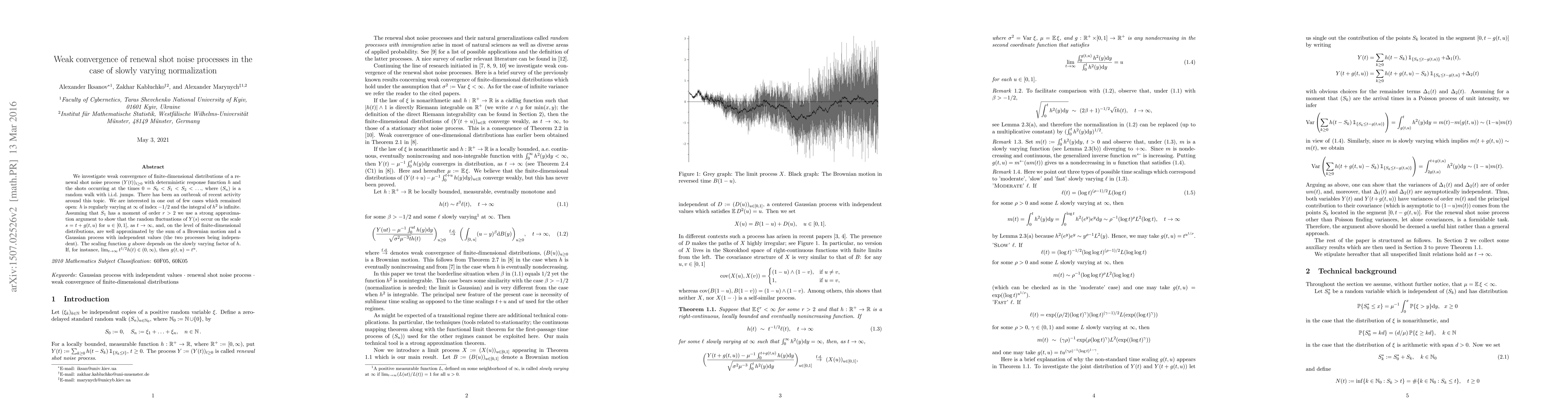We investigate weak convergence of finite-dimensional distributions of a renewal shot noise process $(Y(t))_{t\geq 0}$ with deterministic response function $h$ and the shots occurring at the times $0 = S_0 < S_1 < S_2<\ldots$, where $(S_n)$ is a random walk with i.i.d.\ jumps. There has been an outbreak of recent activity around this topic. We are interested in one out of few cases which remained open: $h$ is regularly varying at $\infty$ of index $-1/2$ and the integral of $h^2$ is infinite. Assuming that $S_1$ has a moment of order $r>2$ we use a strong approximation argument to show that the random fluctuations of $Y(s)$ occur on the scale $s=t+g(t,u)$ for $u\in [0,1]$, as $t\to\infty$, and, on the level of finite-dimensional distributions, are well approximated by the sum of a Brownian motion and a Gaussian process with independent values (the two processes being independent). The scaling function $g$ above depends on the slowly varying factor of $h$. If, for instance, $\lim_{t\to\infty}t^{1/2}h(t)\in (0,\infty)$, then $g(t,u)=t^u$.