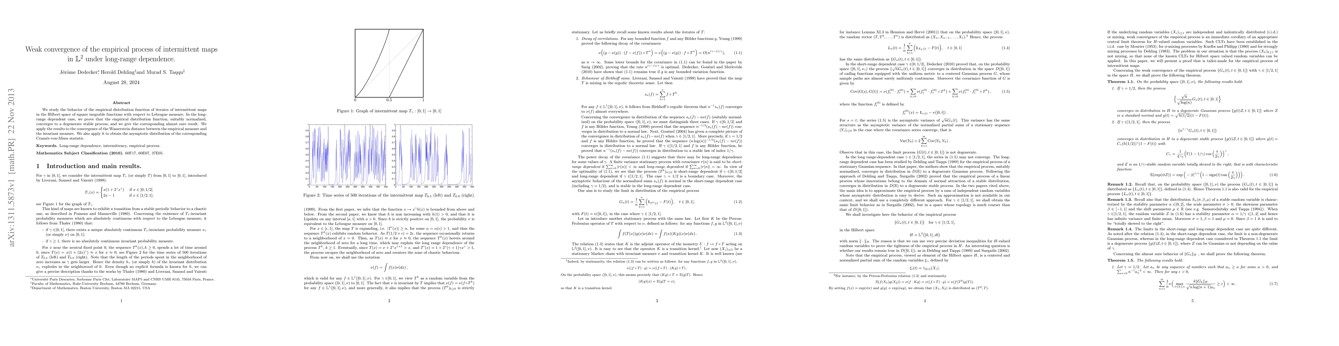 We study the behavior of the empirical distribution function of iterates of intermittent maps in the Hilbert space of square inegrable functions with respect to Lebesgue measure. In the long-range dependent case, we prove that the empirical distribution function, suitably normalized, converges to a degenerate stable process, and we give the corresponding almost sure result. We apply the results to the convergence of the Wasserstein distance between the empirical measure and the invariant measure. We also apply it to obtain the asymptotic distribution of the corresponding Cram\'er-von-Mises statistic.