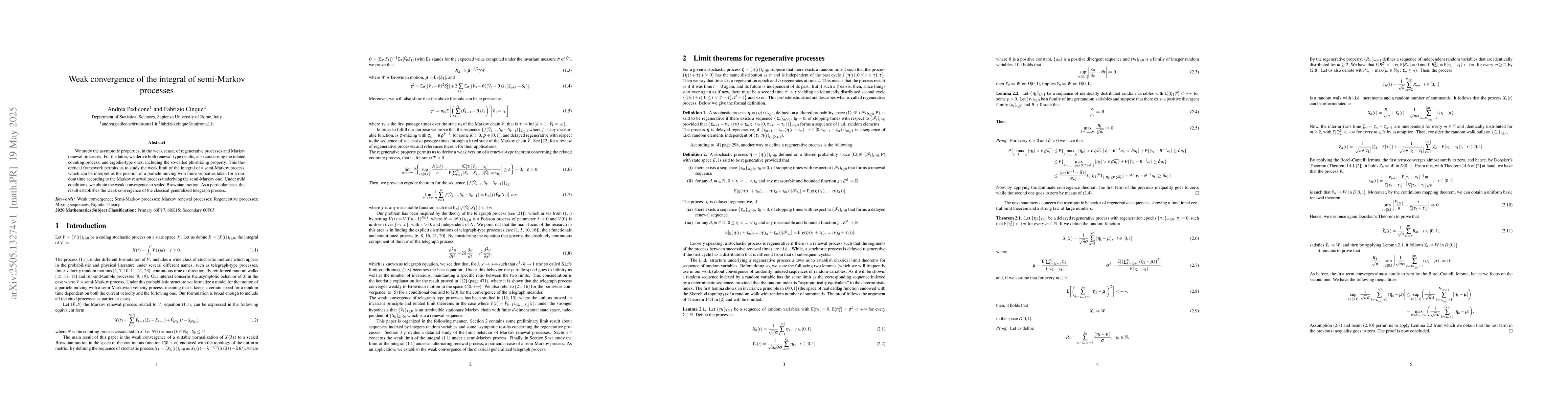 We study the asymptotic properties, in the weak sense, of regenerative processes and Markov renewal processes. For the latter, we derive both renewal-type results, also concerning the related counting process, and ergodic-type ones, including the so-called phi-mixing property. This theoretical framework permits us to study the weak limit of the integral of a semi-Markov process, which can be interpret as the position of a particle moving with finite velocities taken for a random time according to the Markov renewal process underlying the semi-Markov one. Under mild conditions, we obtain the weak convergence to scaled Brownian motion. As a particular case, this result establishes the weak convergence of the classical generalized telegraph process.