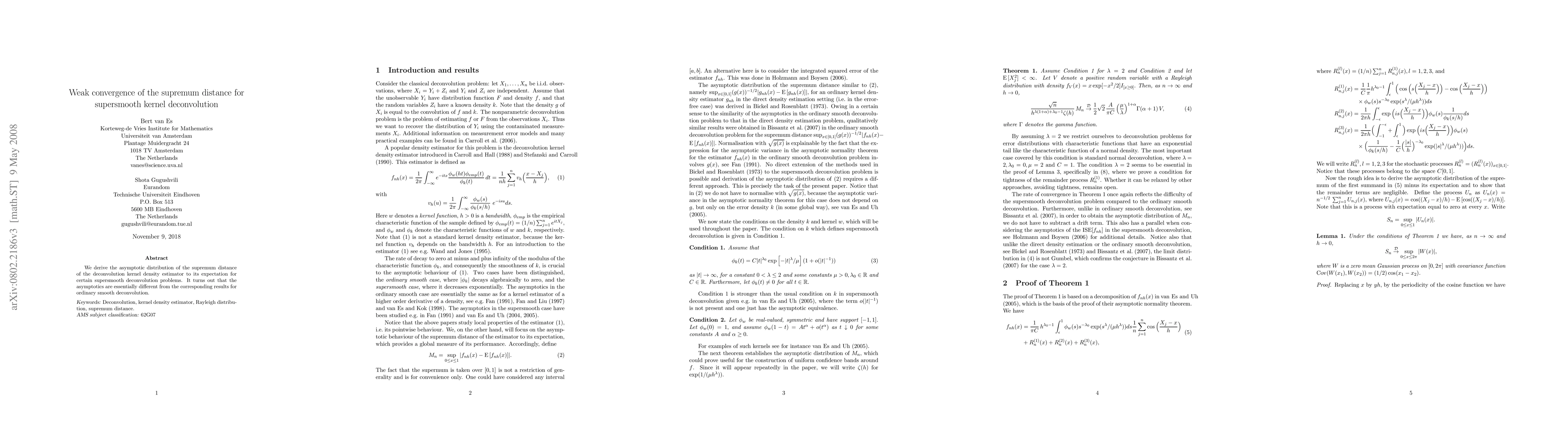 Summary: This paper investigates the asymptotic distribution of the supremum distance for a supersmooth kernel deconvolution kernel density estimator, revealing distinct behavior compared to ordinary smooth deconvolution. The findings highlight unique convergence properties in supersmooth scenarios.
