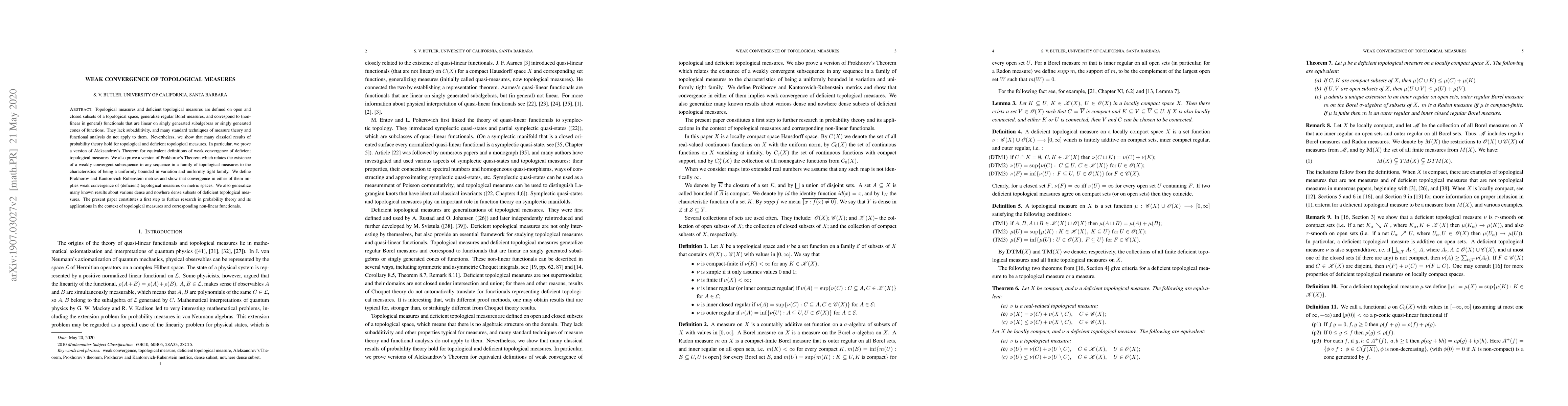 This paper explores weak convergence of topological measures, proving versions of classical probability theorems like Aleksandrov's and Prokhorov's Theorems for these measures. It introduces Prokhorov and Kantorovich-Rubenstein metrics and establishes their equivalence to weak convergence in the context of topological measures.