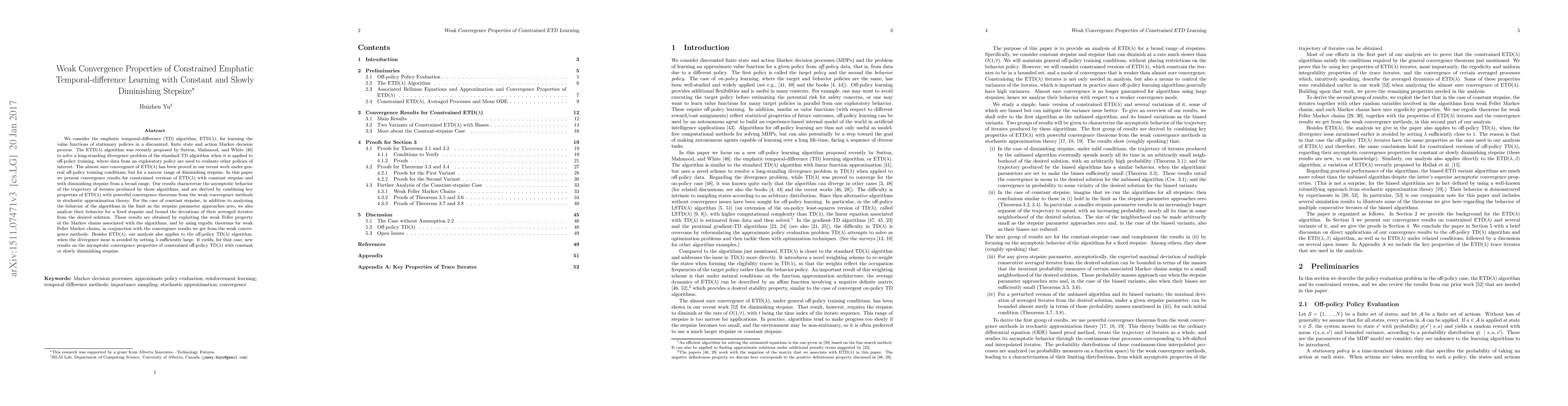 This paper investigates the weak convergence properties of constrained versions of the ETD($\lambda$) algorithm under both constant and diminishing stepsize conditions. It characterizes the asymptotic behavior of the algorithm's iterates and extends convergence results beyond previously narrow stepsize ranges, leveraging weak convergence methods and ergodic theorems for weak Feller Markov chains.