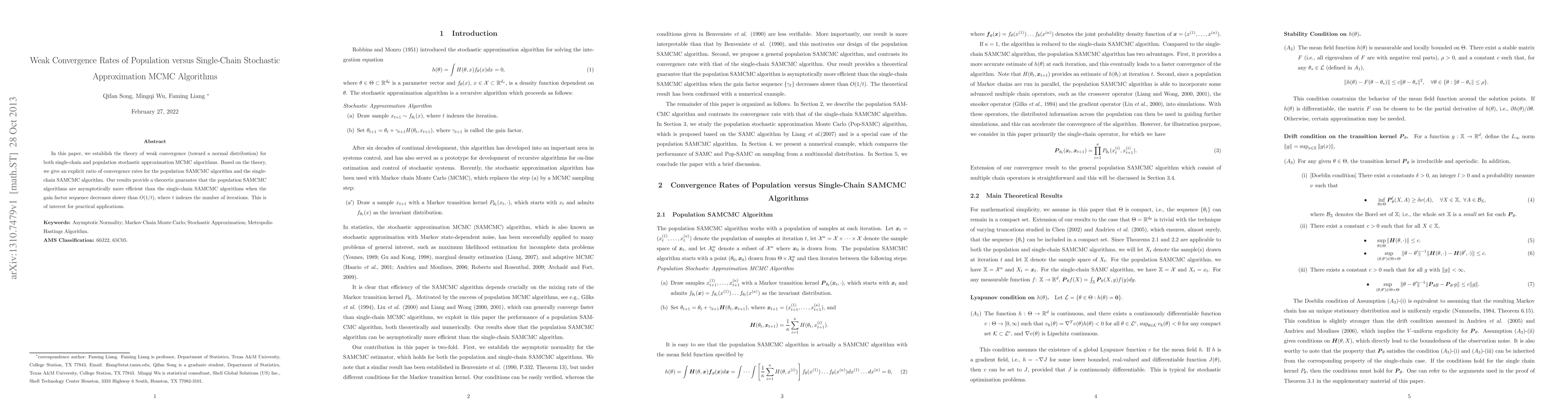 In this paper, we establish the theory of weak convergence (toward a normal distribution) for both single-chain and population stochastic approximation MCMC algorithms. Based on the theory, we give an explicit ratio of convergence rates for the population SAMCMC algorithm and the single-chain SAMCMC algorithm. Our results provide a theoretic guarantee that the population SAMCMC algorithms are asymptotically more efficient than the single-chain SAMCMC algorithms when the gain factor sequence decreases slower than O(1/t), where t indexes the number of iterations. This is of interest for practical applications.