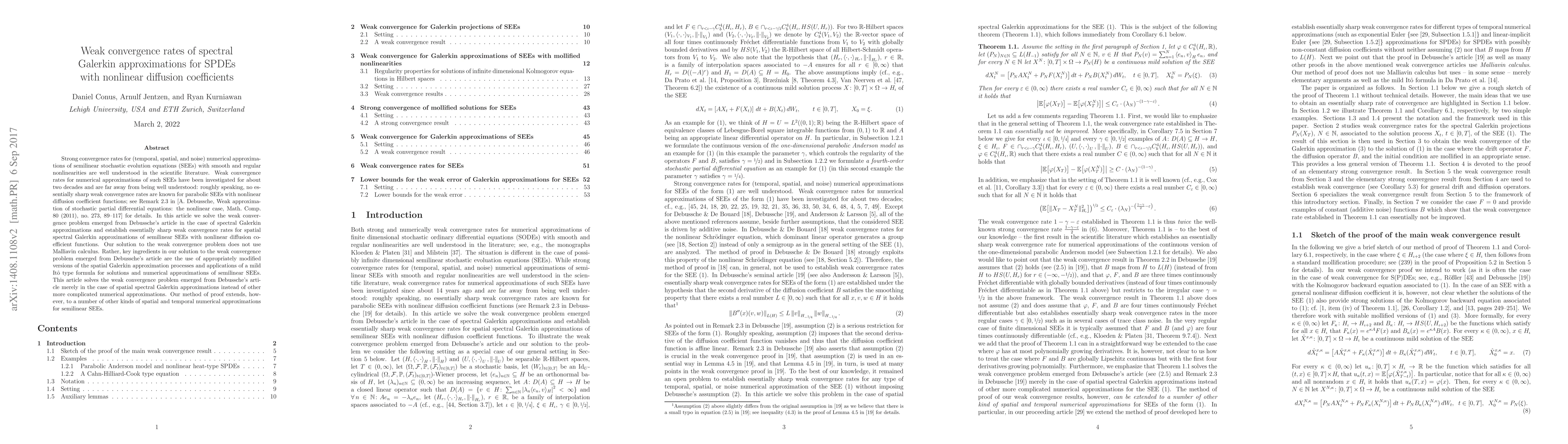 This paper establishes essentially sharp weak convergence rates for spatial spectral Galerkin approximations of semilinear stochastic partial differential equations (SPDEs) with nonlinear diffusion coefficients, solving a long-standing problem in the field. The authors achieve this without using Malliavin calculus, instead employing modified Galerkin processes and a mild Itô formula.