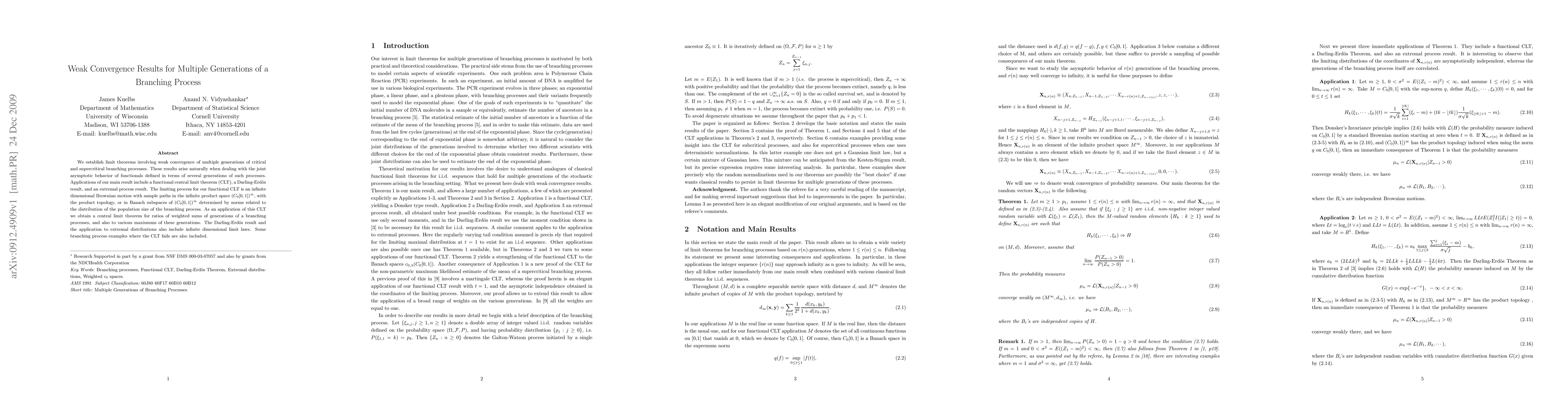 We establish limit theorems involving weak convergence of multiple generations of critical and supercritical branching processes. These results arise naturally when dealing with the joint asymptotic behavior of functionals defined in terms of several generations of such processes. Applications of our main result include a functional central limit theorem (CLT), a Darling-Erd\"os result, and an extremal process result. The limiting process for our functional CLT is an infinite dimensional Brownian motion with sample paths in the infinite product space $(C_0[0,1])^{\infty}$, with the product topology, or in Banach subspaces of $(C_0[0,1])^{\infty}$ determined by norms related to the distribution of the population size of the branching process. As an application of this CLT we obtain a central limit theorem for ratios of weighted sums of generations of a branching processes, and also to various maximums of these generations. The Darling-Erd\"os result and the application to extremal distributions also include infinite dimensional limit laws. Some branching process examples where the CLT fails are also included.